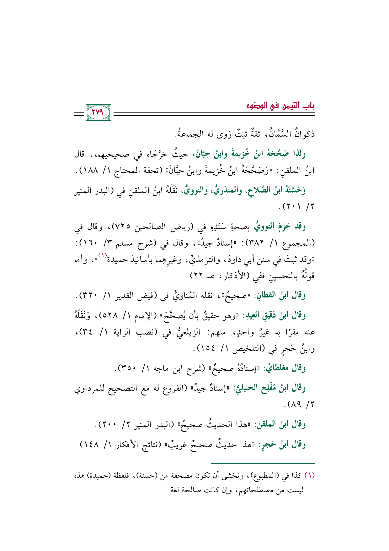 ولذا صَحَّحَهُ ابنُ خُزيمةَ وابنُ حِبَّانَ، حيثُ خرَّجَاه في صحيحيهما، قال ابنُ الملقنِ: "وَصَحَّحَهُ ابنُ خُزيمةَ وابنُ حِبَّانَ" (تحفة المحتاج ١/ ١٨٨).