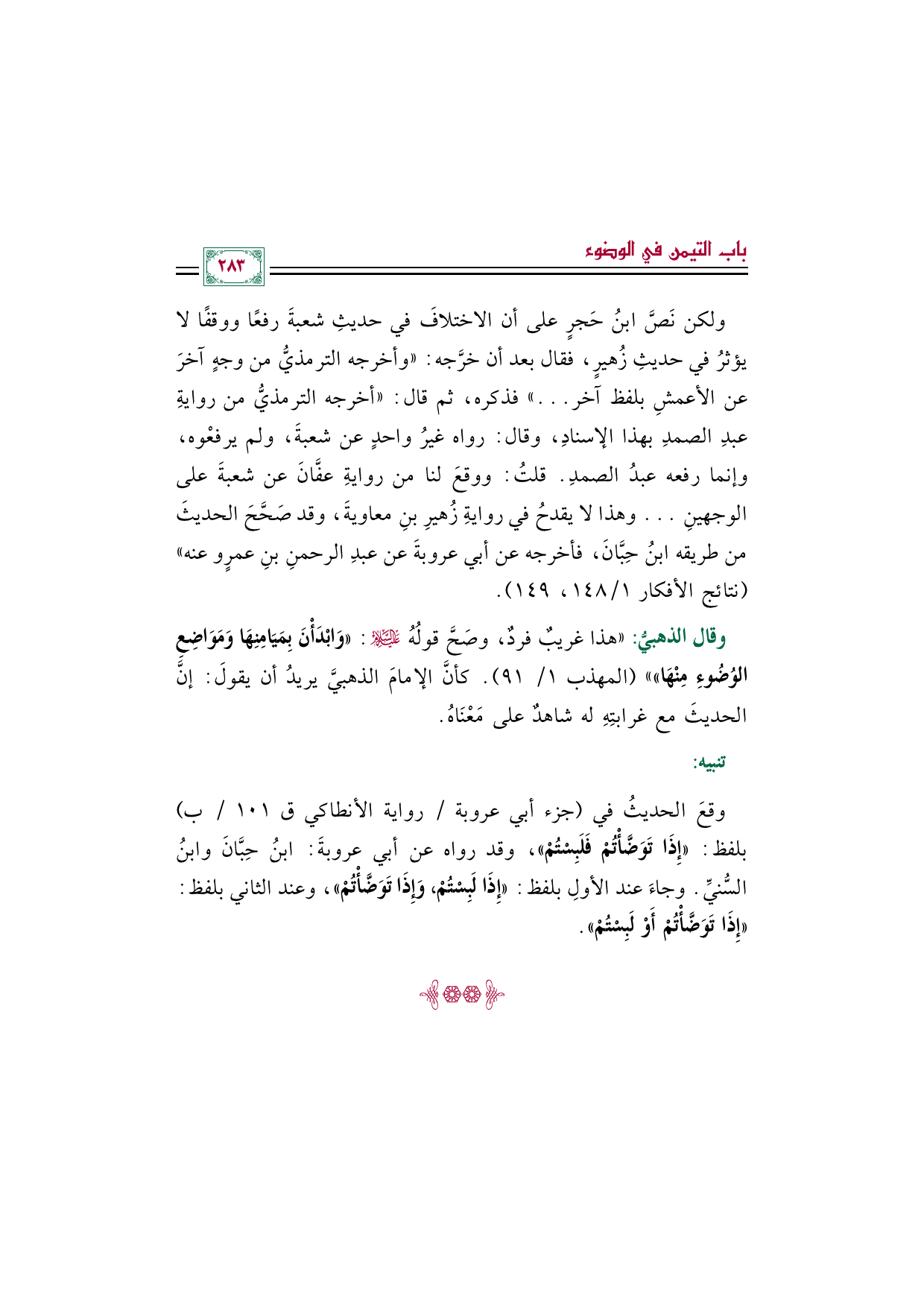 ولكن نَصَّ ابنُ حَجرٍ على أن الاختلافَ في حديثِ شعبةَ رفعًا ووقفًا لا يؤثرُ في حديثِ زُهيرٍ، فقال بعد أن خرَّجه: "وأخرجه الترمذيُّ من وجهٍ آخرَ عن الأعمشِ بلفظ آخر ... " فذكره، ثم قال: "أخرجه الترمذيُّ من روايةِ عبدِ الصمدِ بهذا الإسنادِ، وقال: رواه غيرُ واحدٍ عن شعبةَ، ولم يرفعْوه، وإنما رفعه عبدُ الصمدِ. قلتُ: ووقعَ لنا من روايةِ عفَّانَ عن شعبةَ على الوجهينِ ... وهذا لا يقدحُ في روايةِ زُهيرِ بنِ معاويةَ، وقد صَحَّحَ الحديثَ من طريقه ابنُ حِبَّانَ، فأخرجه عن أبي عروبةَ عن عبدِ الرحمنِ بنِ عمرٍو عنه" (نتائج الأفكار ١/ ١٤٨، ١٤٩).