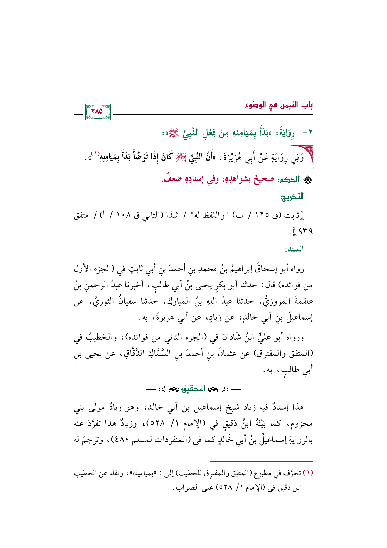• وَفِي رِوَايَةٍ عَنْ أَبِي هُرَيْرَةَ: ((أَنَّ النَّبِيَّ صلى الله عليه وسلم كَانَ إِذَا تَوَضَّأَ بَدَأَ بِمَيَامِنِهِ (¬١))).