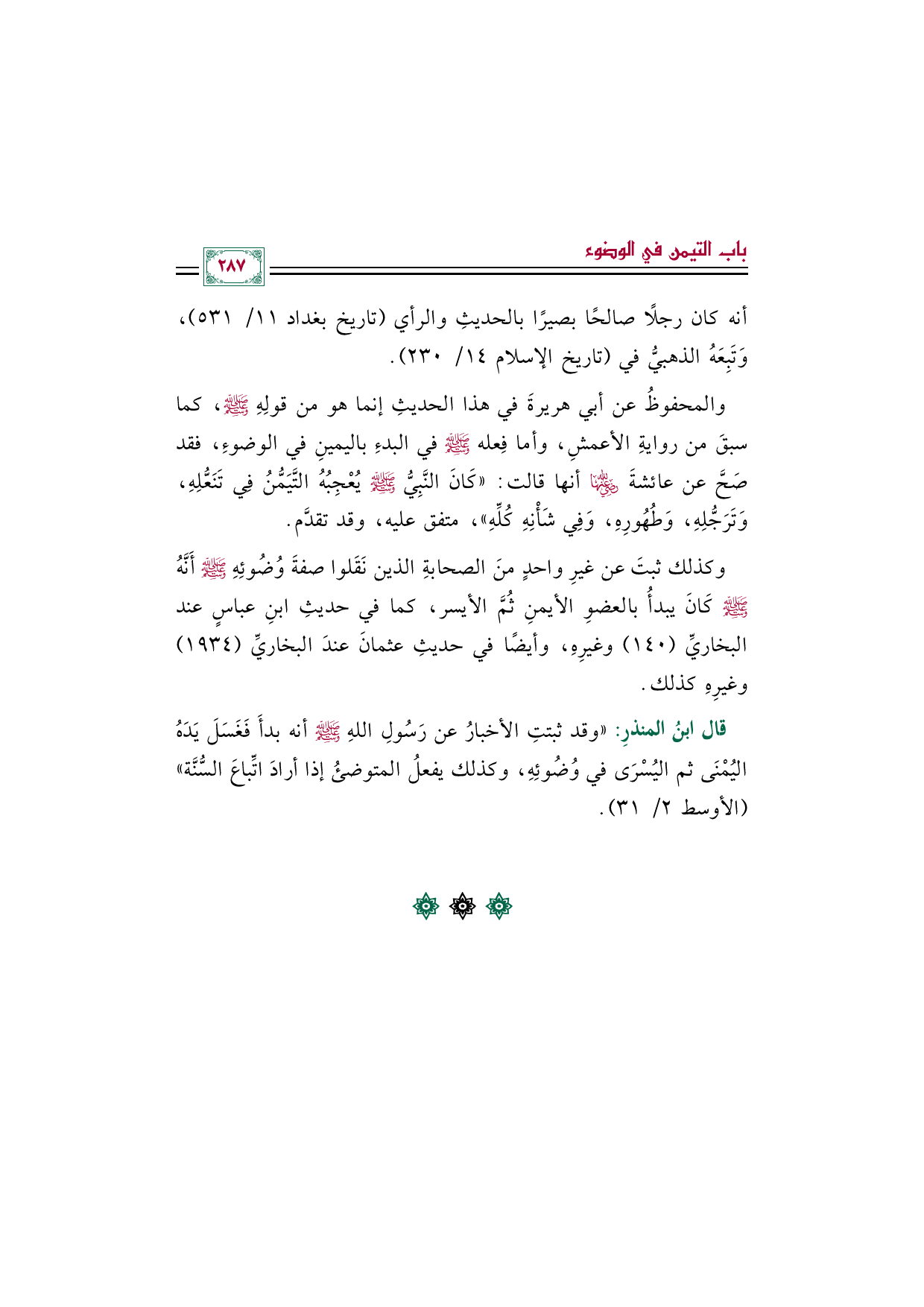 وكذلك ثبتَ عن غيرِ واحدٍ منَ الصحابةِ الذين نَقَلوا صفةَ وُضُوئِهِ صلى الله عليه وسلم أَنَّهُ صلى الله عليه وسلم كَانَ يبدأُ بالعضوِ الأيمنِ ثُمَّ الأيسر، كما في حديثِ ابنِ عباسٍ عند البخاريِّ (١٤٠) وغيرِهِ، وأيضًا في حديثِ عثمانَ عندَ البخاريِّ (١٩٣٤) وغيرِهِ كذلك.