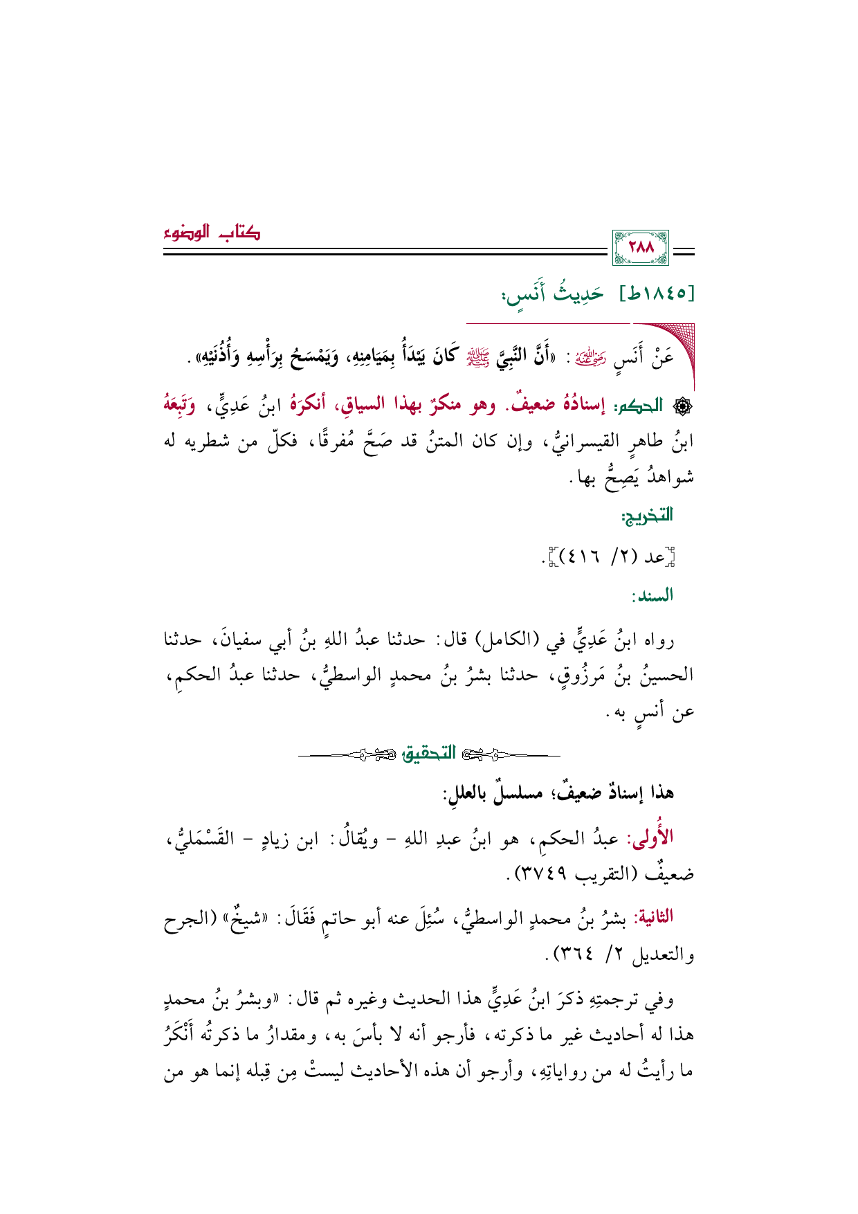 وفي ترجمتِهِ ذكرَ ابنُ عَدِيٍّ هذا الحديث وغيره ثم قال: "وبشرُ بنُ محمدٍ هذا له أحاديث غير ما ذكرته، فأرجو أنه لا بأسَ به، ومقدارُ ما ذكرتُه أَنْكَرُ ما رأيتُ له من رواياتِهِ، وأرجو أن هذه الأحاديث ليستْ مِن قِبله إنما هو من