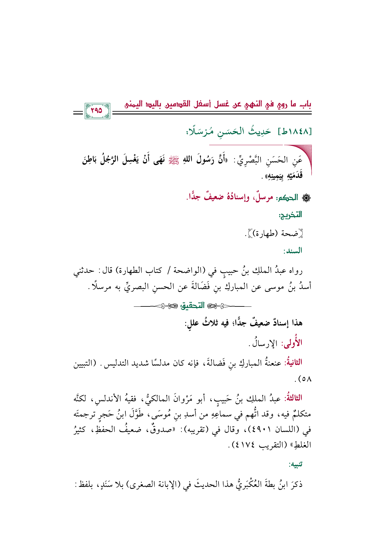 رواه عبدُ الملكِ بنُ حبيبٍ في (الواضحة/ كتاب الطهارة) قال: حدثني أسدُ بنُ موسى عن المباركِ بنِ فَضَالةَ عن الحسنِ البصريِّ به مرسلًا.