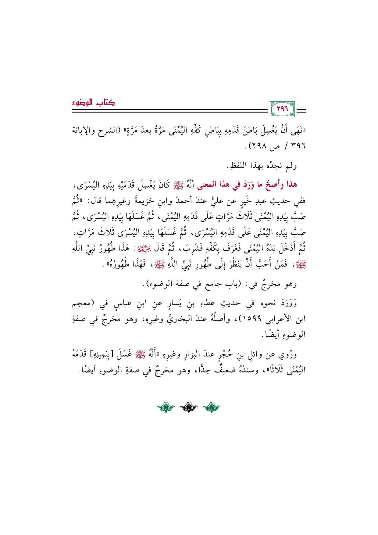 هذا وأصحُّ ما وَرَدَ في هذا المعنى أنَّهُ صلى الله عليه وسلم كَانَ يَغْسِلَ قَدَمَيْهِ بِيَدِهِ اليُسْرَى، ففي حديثِ عبدِ خَيرٍ عن عليٍّ عندَ أحمدَ وابنِ خزيمةَ وغيرِهِما قال: ((ثُمَّ صَبَّ بِيَدِهِ اليُمْنَى ثَلَاثَ مَرَّاتٍ عَلَى قَدَمِهِ اليُمْنَى، ثُمَّ غَسَلَهَا بِيَدِهِ اليُسْرَى، ثُمَّ صَبَّ بِيَدِهِ اليُمْنَى عَلَى قَدَمِهِ اليُسْرَى، ثُمَّ غَسَلَهَا بِيَدِهِ اليُسْرَى ثَلاثَ مَرَّاتٍ، ثُمَّ أَدْخَلَ يَدَهُ اليُمْنَى فَغَرَفَ بِكَفِّهِ فَشَرِبَ، ثُمَّ قَالَ رضي الله عنه: هَذَا طُهُورُ نَبِيِّ اللَّهِ صلى الله عليه وسلم، فَمَنْ أَحَبَّ أَنْ يَنْظُرَ إِلَى طُهُورِ نَبِيِّ اللَّهِ صلى الله عليه وسلم، فَهَذَا طُهُورُهُ)).