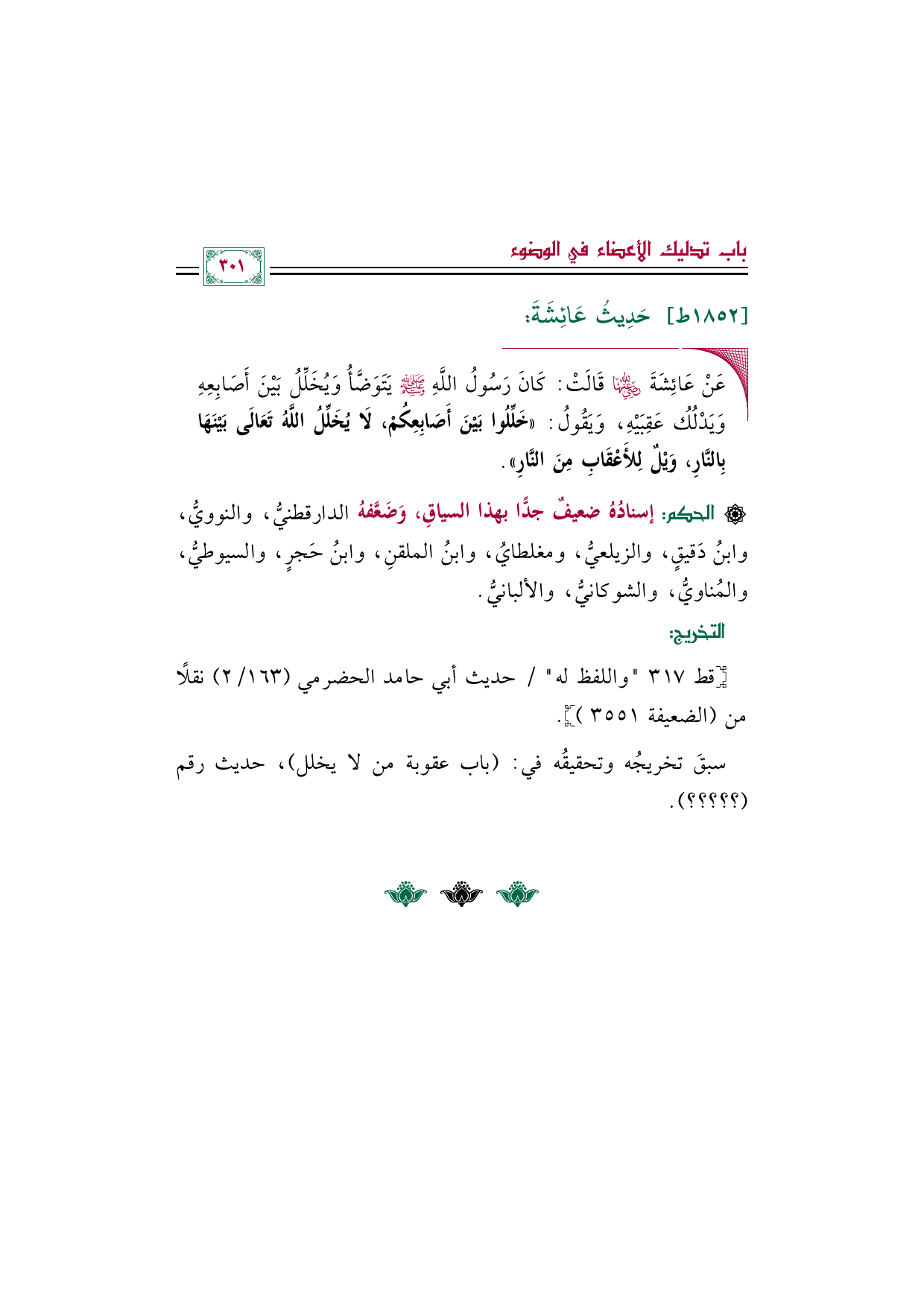 ◼ عَنْ عَائِشَةَ رضي الله عنها قَالَتْ: كَانَ رَسُولُ اللَّهِ صلى الله عليه وسلم يَتَوَضَّأُ وَيُخَلِّلُ بَيْنَ أَصَابِعِهِ وَيَدْلُكُ عَقِبَيْهِ، وَيَقُولُ: ((خَلِّلُوا بَيْنَ أَصَابِعِكُمْ، لَا يُخَلِّلُ اللَّهُ تَعَالَى بَيْنَهَا بِالنَّارِ، وَيْلٌ لِلأَعْقَابِ مِنَ النَّارِ)).