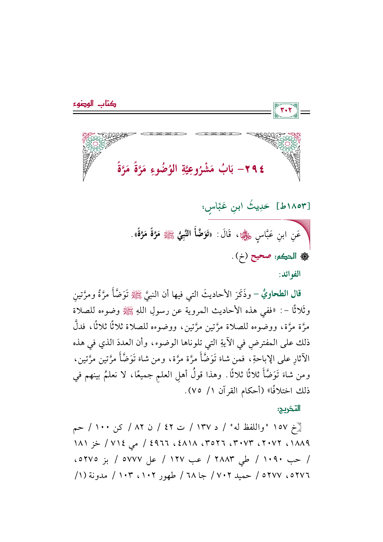 ٢٩٤ - بَابُ مَشْرُوعِيَّةِ الوُضُوءِ مَرَّةً مَرَّةً