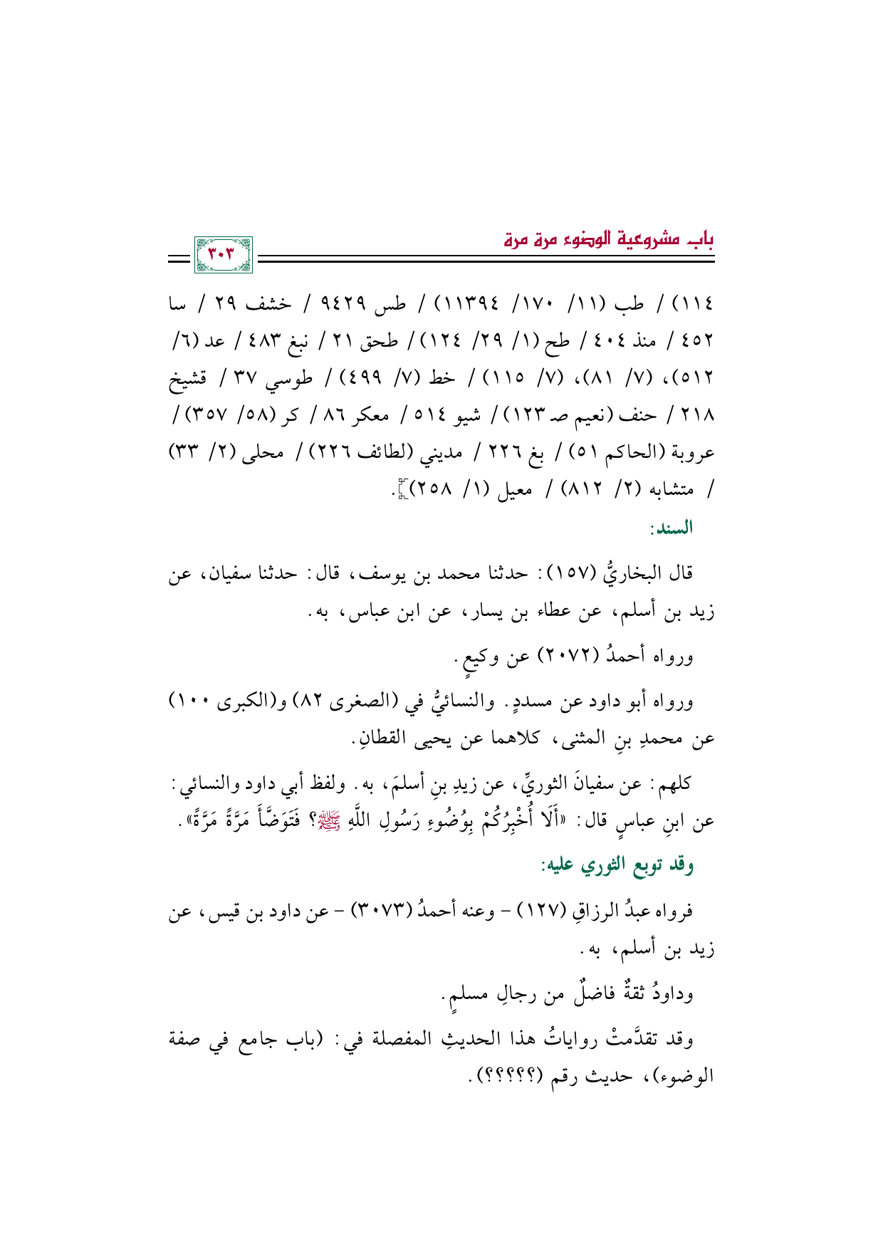 كلهم: عن سفيانَ الثوريِّ، عن زيدِ بنِ أسلمَ، به. ولفظ أبي داود والنسائي: عن ابنِ عباسٍ قال: ((أَلَا أُخْبِرُكُمْ بِوُضُوءِ رَسُولِ اللَّهِ صلى الله عليه وسلم؟ فَتَوَضَّأَ مَرَّةً مَرَّةً)).