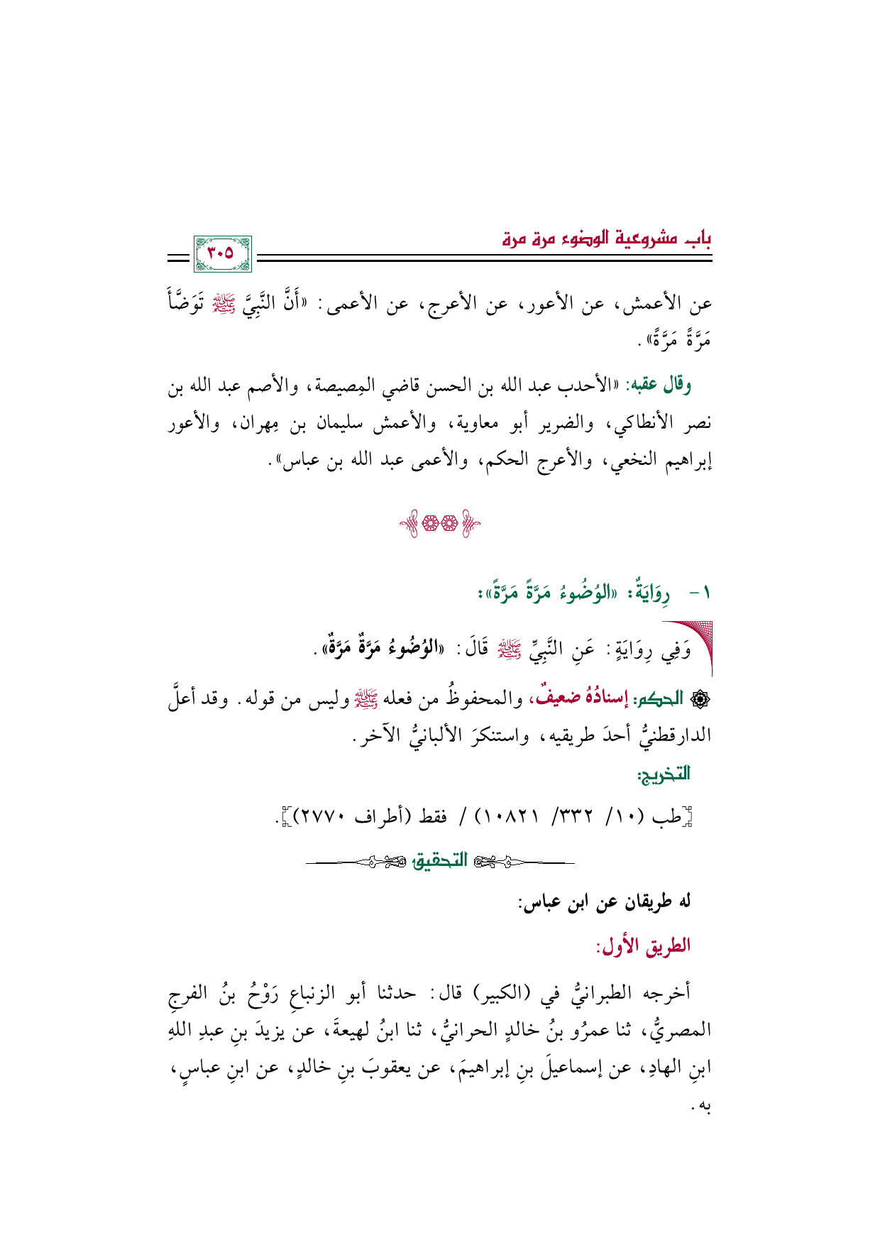 عن الأعمش، عن الأعور، عن الأعرج، عن الأعمى: ((أَنَّ النَّبِيَّ صلى الله عليه وسلم تَوَضَّأَ مَرَّةً مَرَّةً)).
