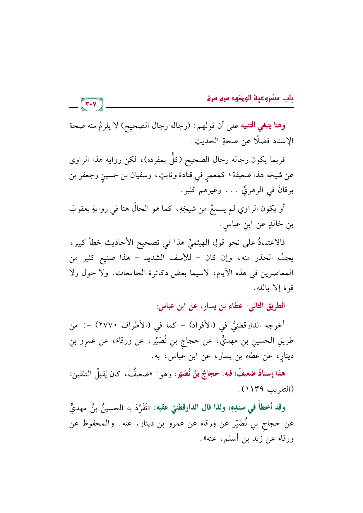 وقد أخطأَ في سندِهِ؛ ولذا قال الدارقطنيُّ عقبه: "تَفَرَّدَ به الحسينُ بنُ مهديٍّ عن حجاجِ بنِ نُصَيْر عن ورقاء عن عمرو بن دينار، عنه. والمحفوظ عن ورقاء عن زيد بن أسلم، عنه".
