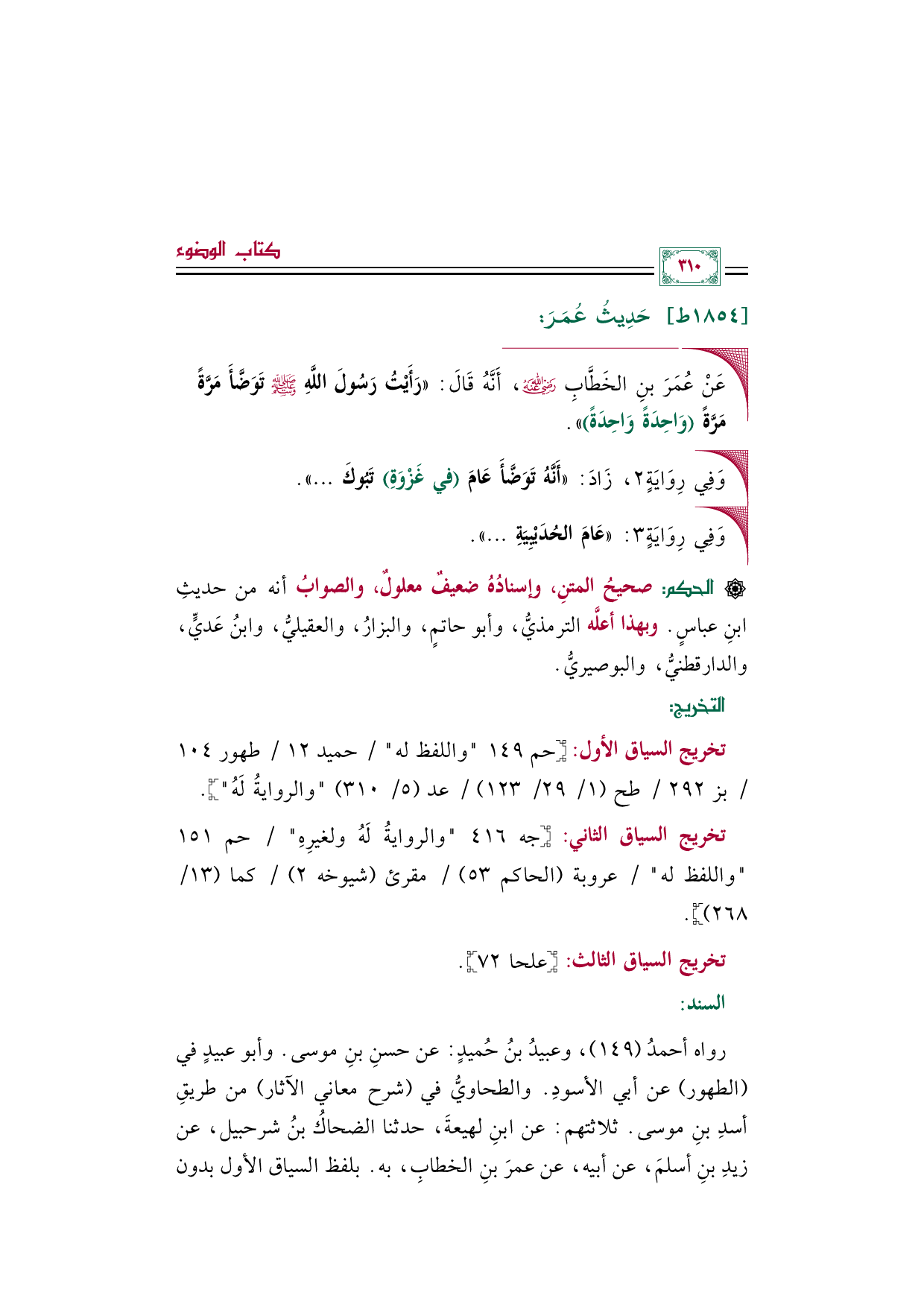 رواه أحمدُ (١٤٩)، وعبيدُ بنُ حُميدٍ: عن حسنِ بنِ موسى. وأبو عبيدٍ في (الطهور) عن أبي الأسودِ. والطحاويُّ في (شرح معاني الآثار) من طريقِ أسدِ بنِ موسى. ثلاثتهم: عن ابنِ لهيعةَ، حدثنا الضحاكُ بنُ شرحبيل، عن زيدِ بنِ أسلمَ، عن أبيه، عن عمرَ بنِ الخطابِ، به. بلفظ السياق الأول بدون