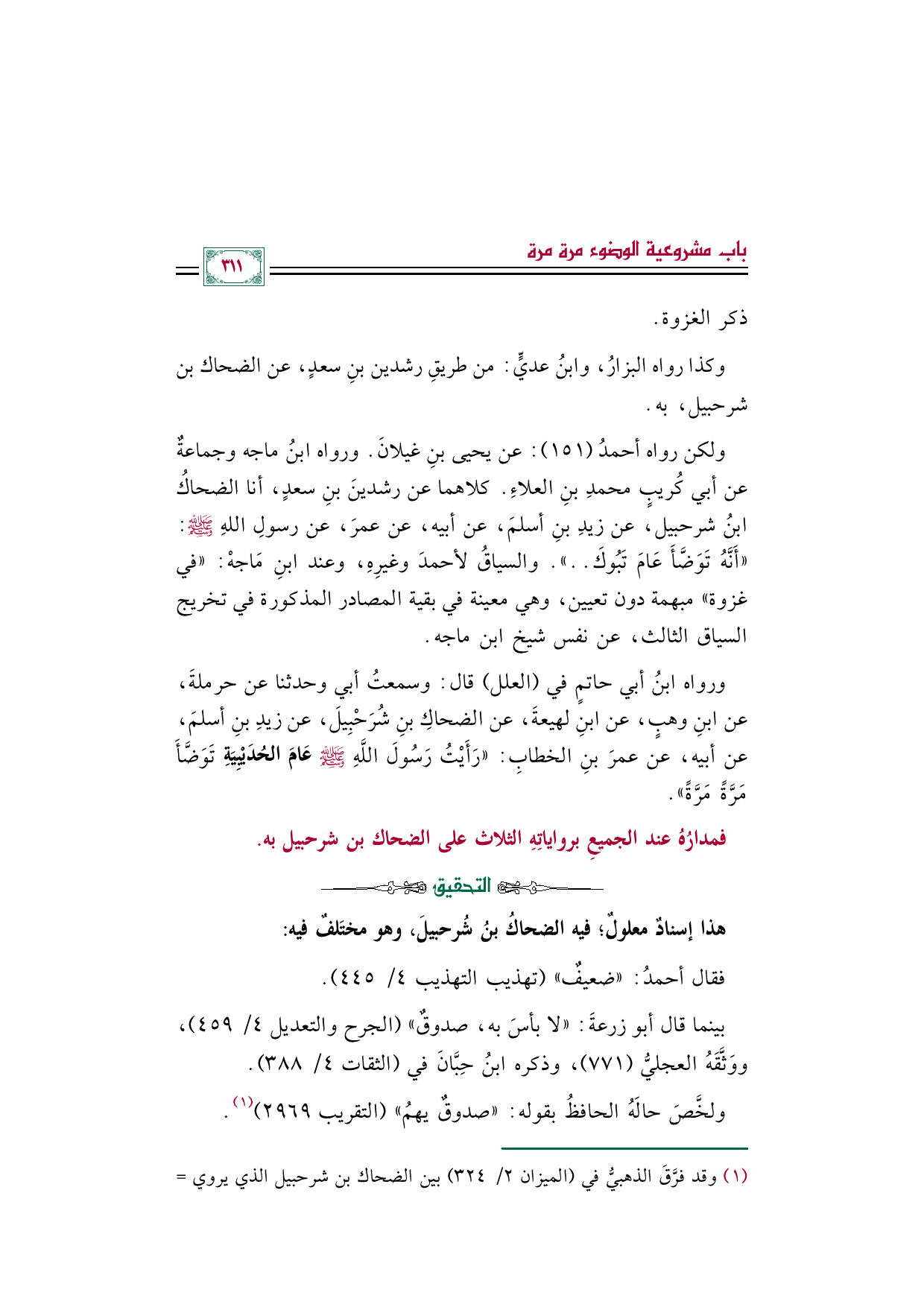 ورواه ابنُ أبي حاتمٍ في (العلل) قال: وسمعتُ أبي وحدثنا عن حرملةَ، عن ابنِ وهبٍ، عن ابنِ لهيعةَ، عن الضحاكِ بنِ شُرَحْبِيلَ، عن زيدِ بنِ أسلمَ، عن أبيه، عن عمرَ بنِ الخطابِ: ((رَأَيْتُ رَسُولَ اللَّهِ صلى الله عليه وسلم عَامَ الحُدَيْبِيَةِ تَوَضَّأَ مَرَّةً مَرَّةً)).