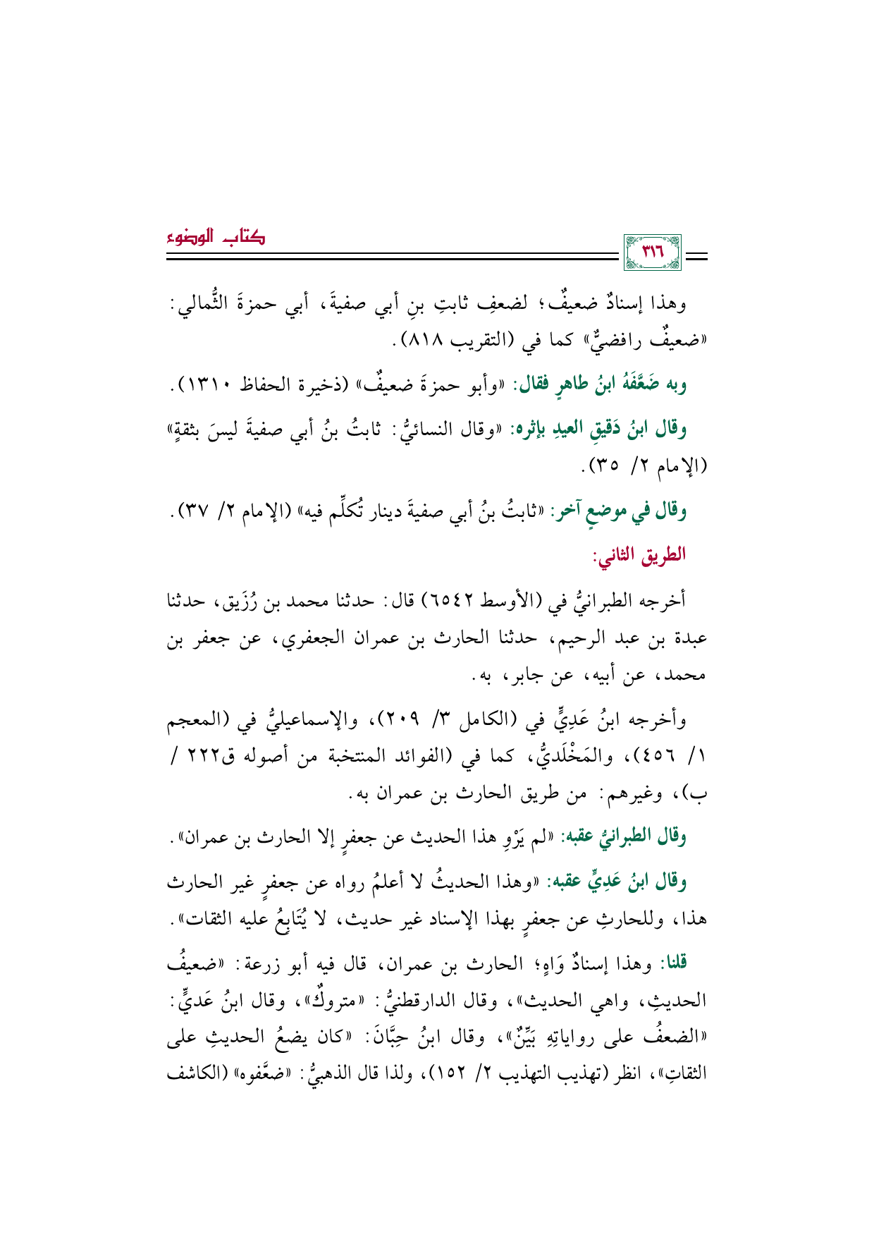 وقال الطبرانيُّ عقبه: "لم يَرْوِ هذا الحديث عن جعفرٍ إلا الحارث بن عمران".