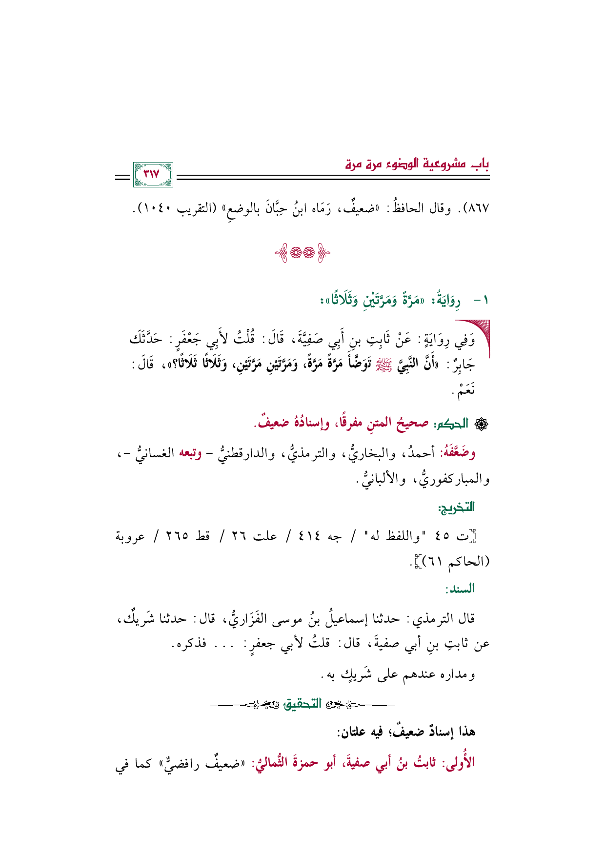 قال الترمذي: حدثنا إسماعيلُ بنُ موسى الفَزَاريُّ، قال: حدثنا شَريكٌ، عن ثابتِ بنِ أبي صفيةَ، قال: قلتُ لأبي جعفرٍ: ... فذكره.