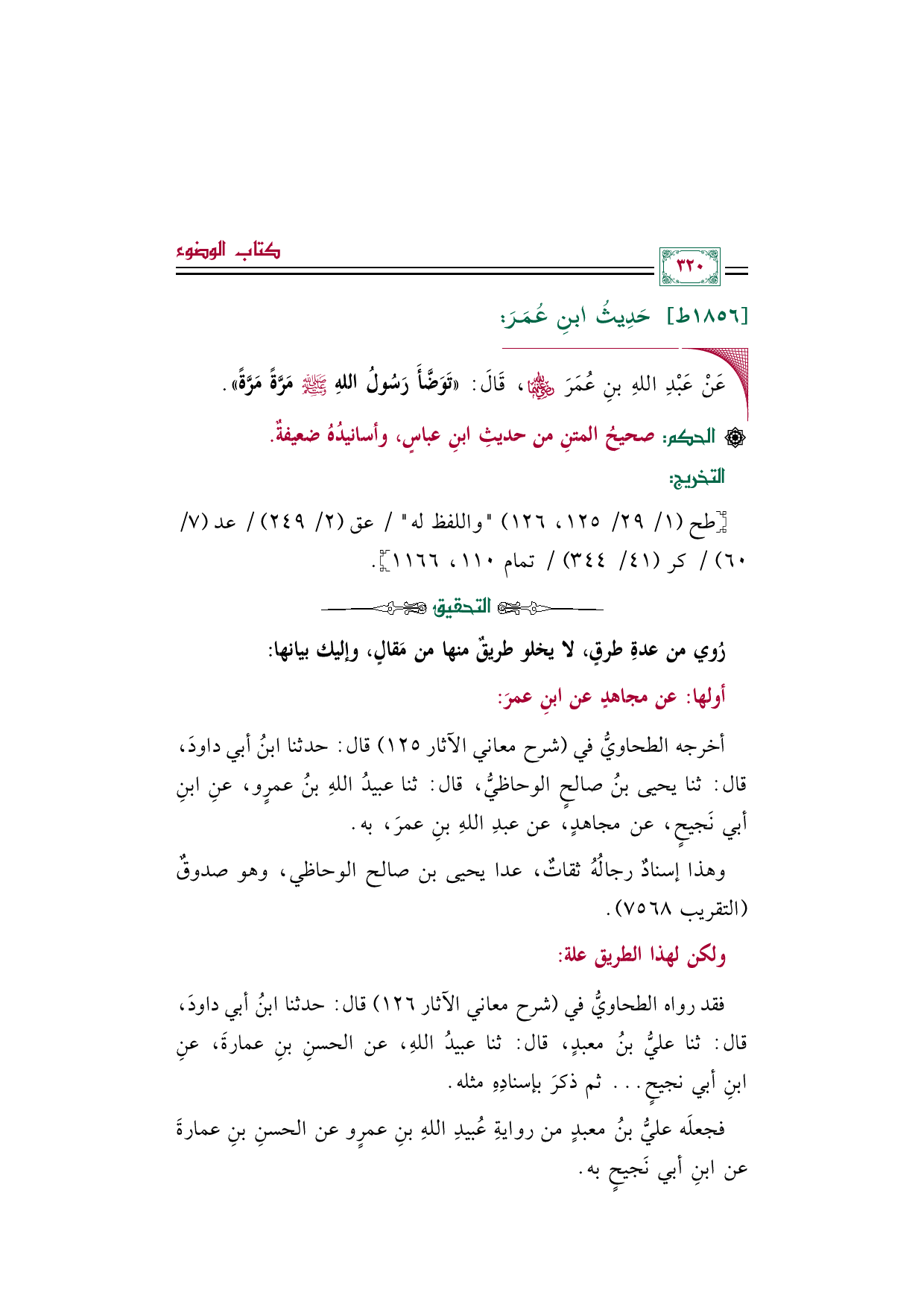 أخرجه الطحاويُّ في (شرح معاني الآثار ١٢٥) قال: حدثنا ابنُ أبي داودَ، قال: ثنا يحيى بنُ صالحٍ الوحاظيُّ، قال: ثنا عبيدُ اللهِ بنُ عمرٍو، عنِ ابنِ أبي نَجيحٍ، عن مجاهدٍ، عن عبدِ اللهِ بنِ عمرَ، به.