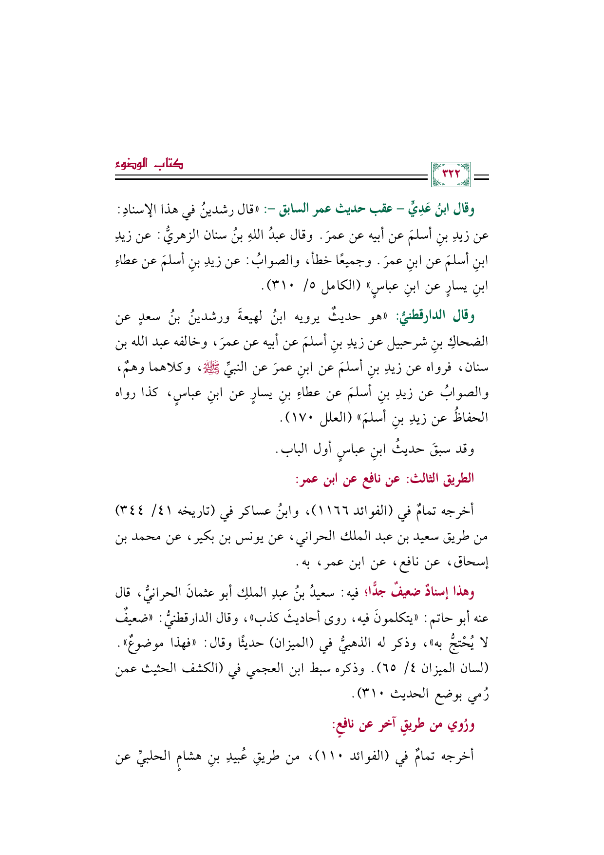 وقال ابنُ عَدِيٍّ -عقب حديث عمر السابق-: "قال رشدينُ في هذا الإسنادِ: عن زيدِ بنِ أسلمَ عن أبيه عن عمرَ. وقال عبدُ اللهِ بنُ سنان الزهريُّ: عن زيدِ بنِ أسلمَ عن ابنِ عمرَ. وجميعًا خطأ، والصوابُ: عن زيدِ بنِ أسلمَ عن عطاءِ بنِ يسارٍ عن ابنِ عباسٍ" (الكامل ٥/ ٣١٠).