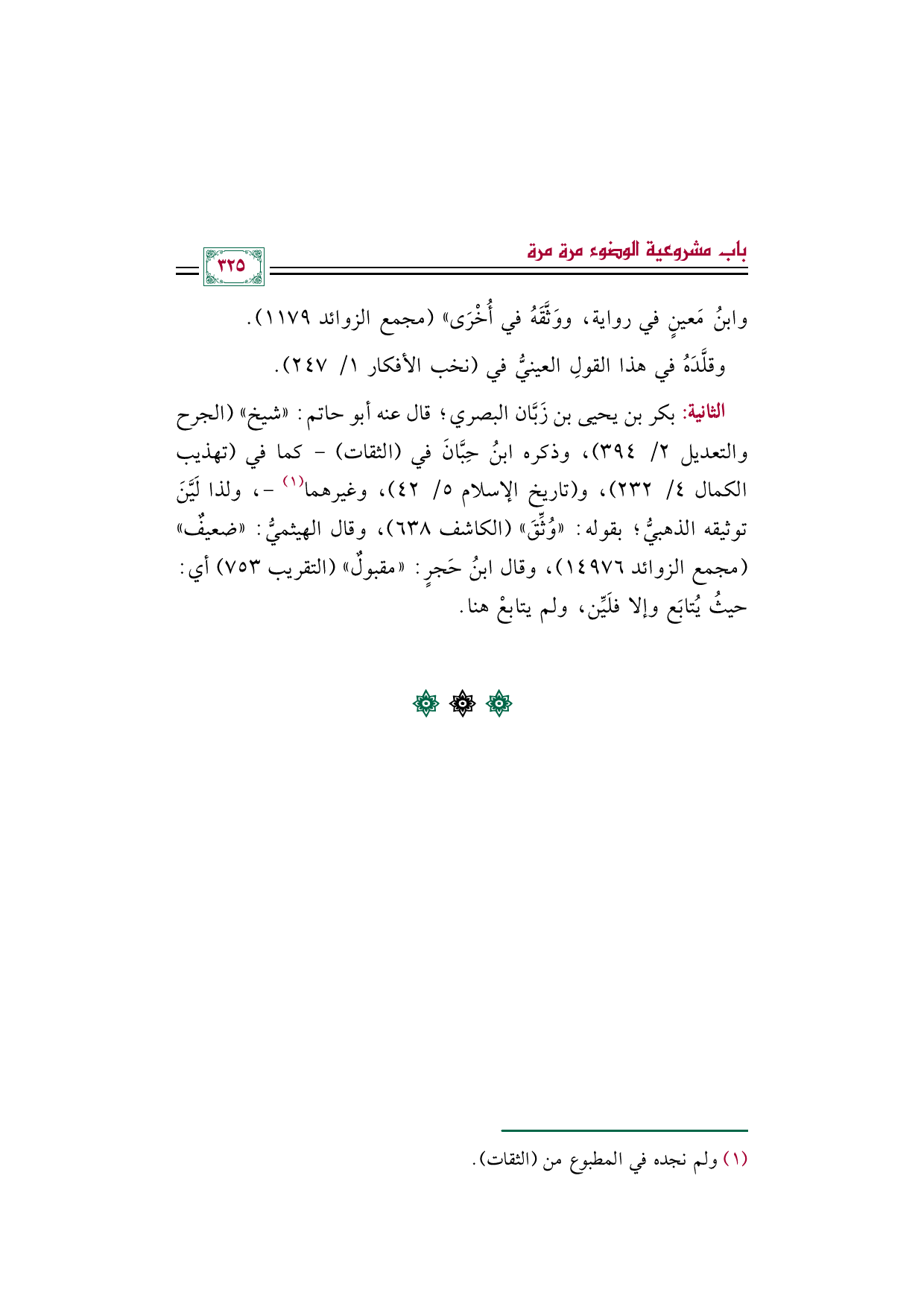 الثانية: بكر بن يحيى بن زَبَّان البصري؛ قال عنه أبو حاتم: "شيخ" (الجرح والتعديل ٢/ ٣٩٤)، وذكره ابنُ حِبَّانَ في (الثقات) -كما في (تهذيب الكمال ٤/ ٢٣٢)، و (تاريخ الإسلام ٥/ ٤٢)، وغيرهما (¬١) -، ولذا لَيَّنَ توثيقه الذهبيُّ؛ بقوله: "وُثِّقَ" (الكاشف ٦٣٨)، وقال الهيثميُّ: "ضعيفٌ" (مجمع الزوائد ١٤٩٧٦)، وقال ابنُ حَجرٍ: "مقبولٌ" (التقريب ٧٥٣) أي: حيثُ يُتابَع وإلا فلَيِّن، ولم يتابعْ هنا.