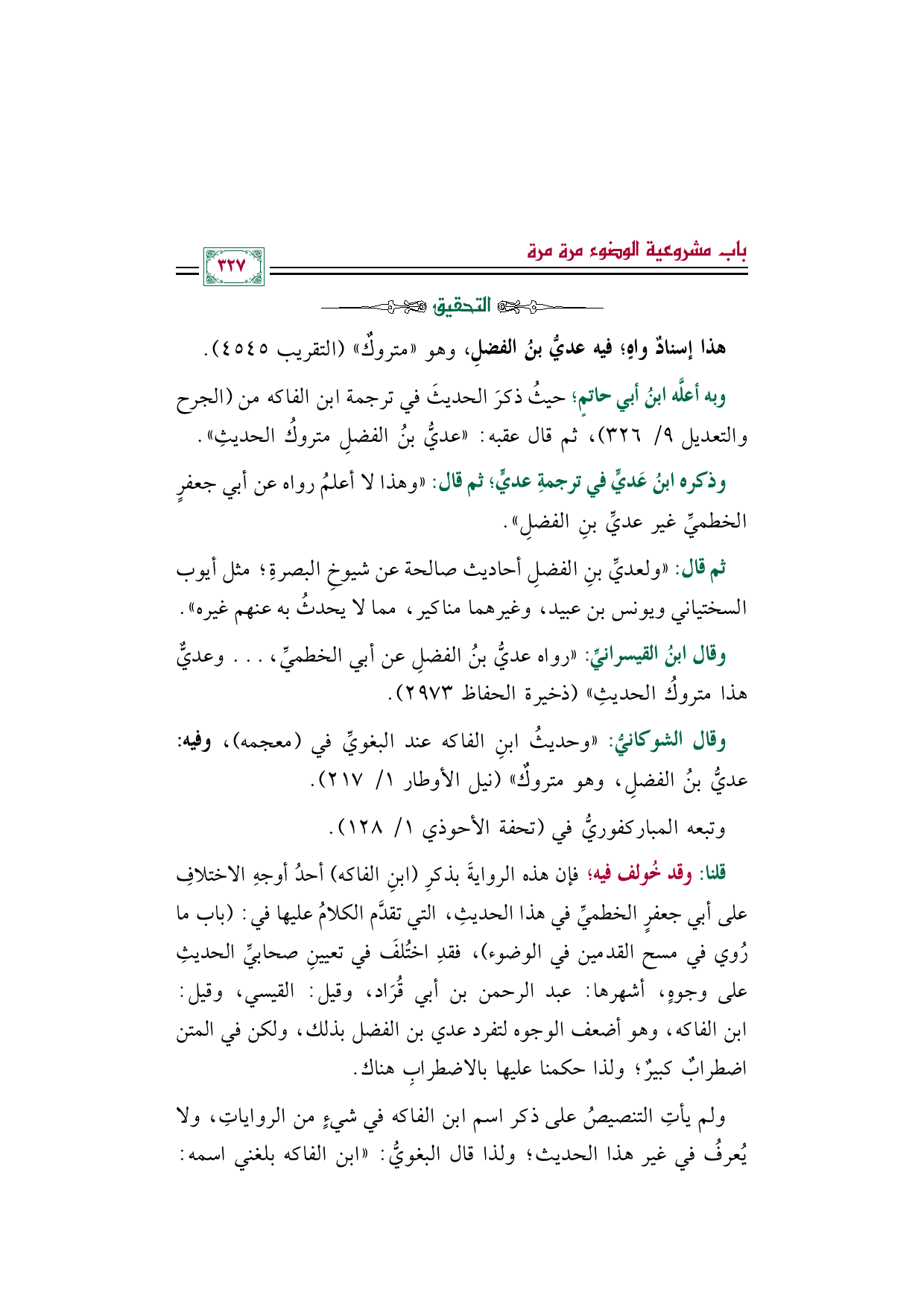 قلنا: وقد خُولف فيه؛ فإن هذه الروايةَ بذكرِ (ابنِ الفاكه) أحدُ أوجهِ الاختلافِ على أبي جعفرٍ الخطميِّ في هذا الحديثِ، التي تقدَّم الكلامُ عليها في: (باب ما رُوي في مسح القدمين في الوضوء)، فقدِ اختُلفَ في تعيينِ صحابيِّ الحديثِ على وجوهٍ، أشهرها: عبد الرحمن بن أبي قُرَاد، وقيل: القيسي، وقيل: ابن الفاكه، وهو أضعف الوجوه لتفرد عدي بن الفضل بذلك، ولكن في المتن اضطرابٌ كبيرٌ؛ ولذا حكمنا عليها بالاضطرابِ هناك.