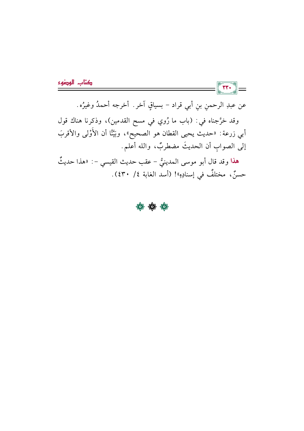 وقد خرَّجناه في: (باب ما رُوي في مسح القدمين)، وذكرنا هناك قول أبي زرعة: "حديث يحيى القطان هو الصحيح"، وبَيَّنَّا أن الأَوْلى والأقربَ إلى الصوابِ أن الحديثَ مضطربٌ، والله أعلم.