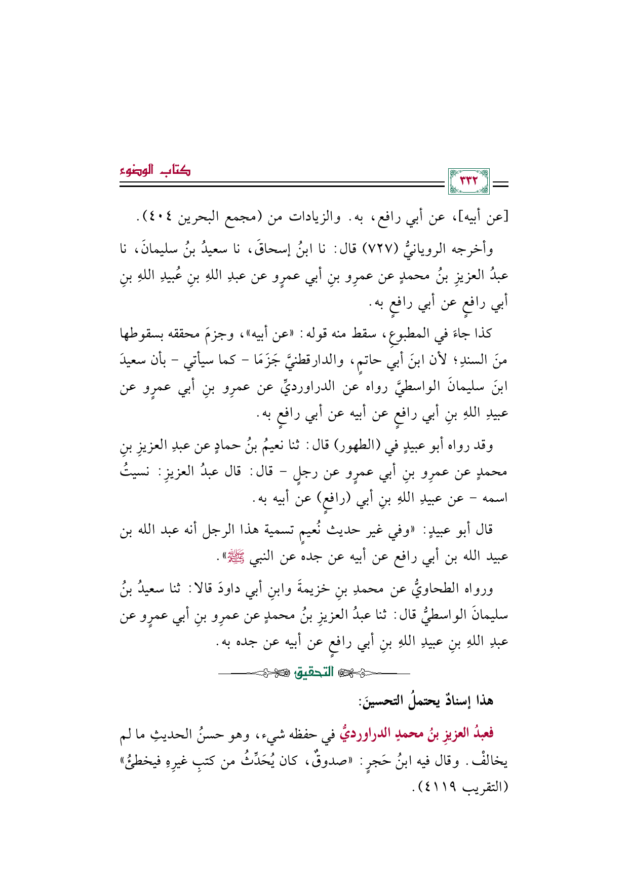 وقد رواه أبو عبيدٍ في (الطهور) قال: ثنا نعيمُ بنُ حمادٍ عن عبدِ العزيزِ بنِ محمدٍ عن عمرِو بنِ أبي عمرٍو عن رجلٍ -قال: قال عبدُ العزيزِ: نسيتُ اسمه- عن عبيدِ اللهِ بنِ أبي (رافعٍ) عن أبيه به.