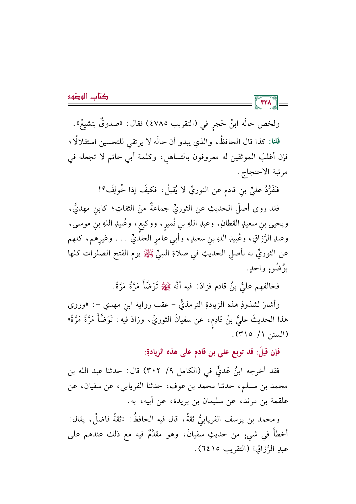 وأشارَ لشذوذِ هذه الزيادةِ الترمذيُّ -عقب رواية ابنِ مهدي-: "وروى هذا الحديثَ عليُّ بنُ قادِمٍ، عن سفيانَ الثوريِّ، وزادَ فيه: تَوَضَّأَ مَرَّةً مَرَّةً" (السنن ١/ ٣١٥).