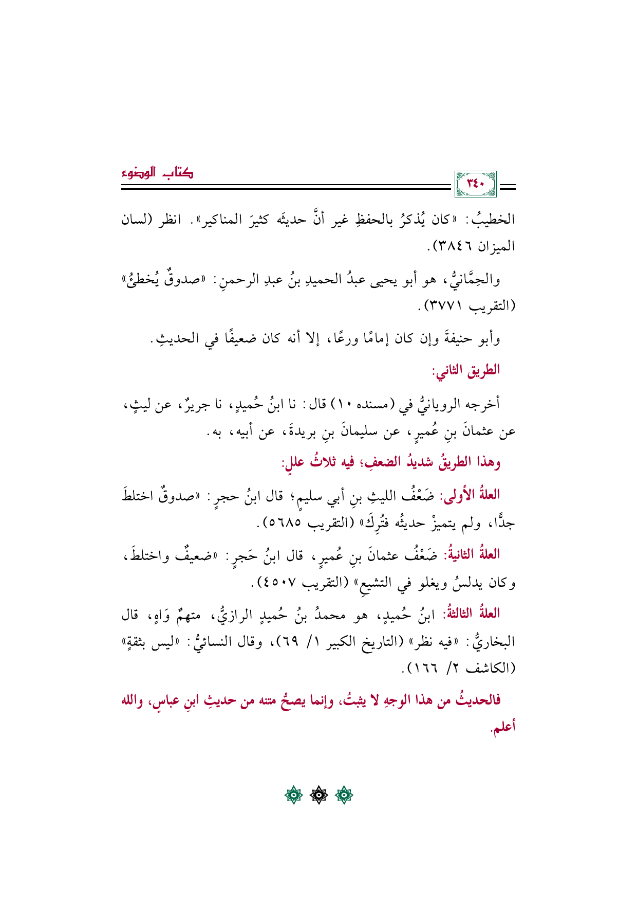 العلةُ الثالثةُ: ابنُ حُميدٍ، هو محمدُ بنُ حُميدٍ الرازيُّ، متهمٌ وَاهٍ، قال البخاريُّ: "فيه نظر" (التاريخ الكبير ١/ ٦٩)، وقال النسائيُّ: "ليس بثقةٍ" (الكاشف ٢/ ١٦٦).