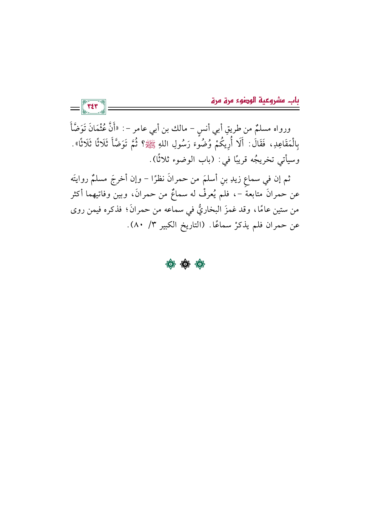 ورواه مسلمٌ من طريقِ أبي أنسٍ -مالك بن أبي عامر-: ((أَنَّ عُثْمَانَ تَوَضَّأَ بِالْمَقَاعِدِ، فَقَالَ: أَلَا أُرِيكُمْ وُضُوءَ رَسُولِ اللهِ صلى الله عليه وسلم؟ ثُمَّ تَوَضَّأَ ثَلَاثًا ثَلَاثًا)). وسيأتي تخريجُه قريبًا في: (باب الوضوء ثلاثًا).