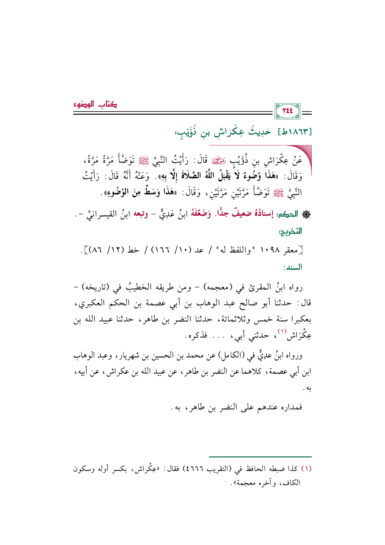 ◼ عَنْ عِكْرَاشِ بنِ ذُؤَيْبٍ رضي الله عنه قَالَ: رَأَيْتُ النَّبِيَّ صلى الله عليه وسلم تَوَضَّأَ مَرَّةً مَرَّةً، وَقَالَ: «هَذَا وُضُوءٌ لَا يَقْبَلُ اللَّهُ الصَّلَاةَ إِلَّا بِهِ». وَعَنْهُ أَنَّهُ قَالَ: رَأَيْتُ النَّبِيَّ صلى الله عليه وسلم تَوَضَّأَ مَرَّتَيْنِ مَرَّتَيْنِ، وَقَالَ: «هَذَا وَسَطٌ مِنَ الوُضُوءِ».