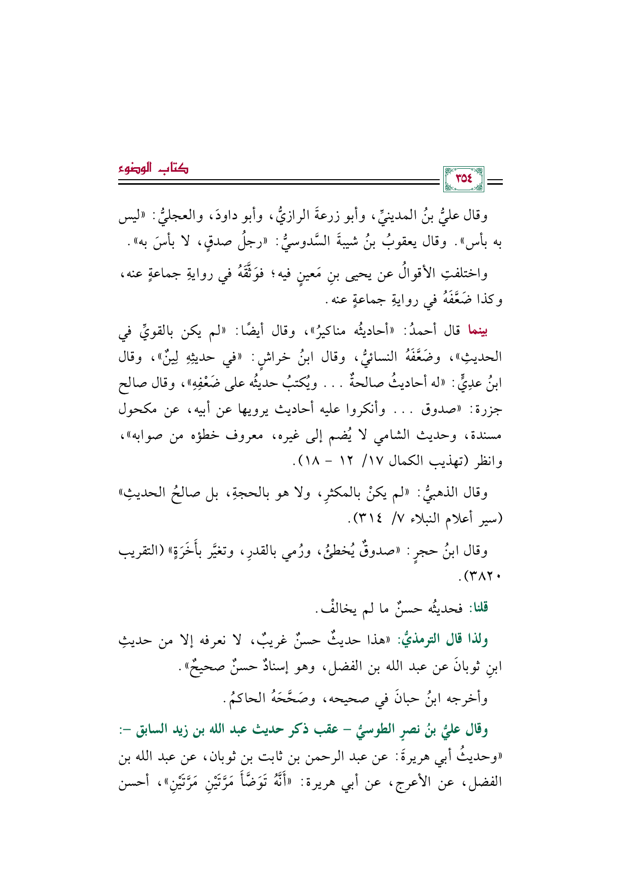 وقال عليُّ بنُ نصرٍ الطوسيُّ -عقب ذكر حديث عبد الله بن زيد السابق-: "وحديثُ أبي هريرةَ: عن عبد الرحمن بن ثابت بن ثوبان، عن عبد الله بن الفضل، عن الأعرج، عن أبي هريرة: ((أَنَّهُ تَوَضَّأَ مَرَّتَيْنِ مَرَّتَيْنِ))، أحسن