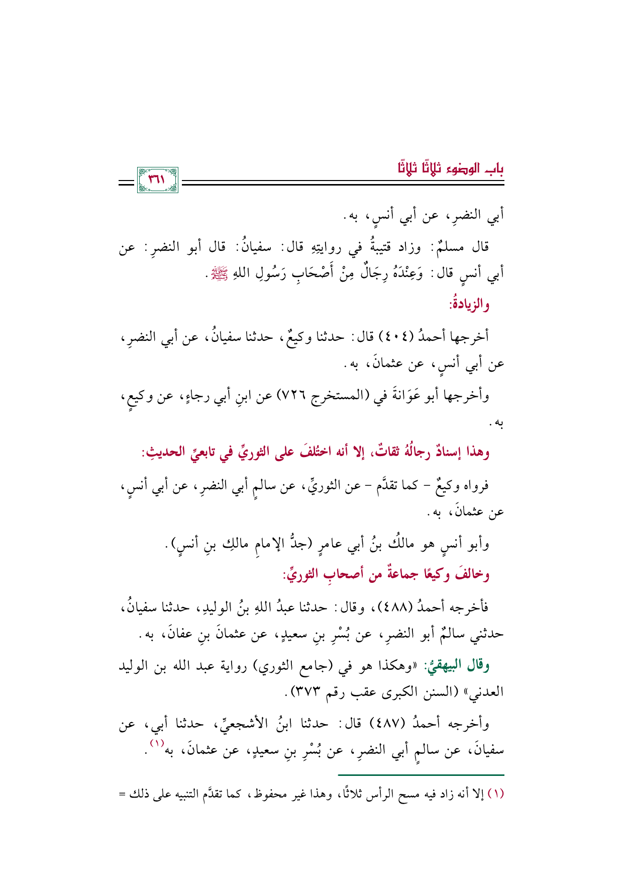 (¬١) إلا أنه زاد فيه مسح الرأس ثلاثًا، وهذا غير محفوظ، كما تقدَّم التنبيه على ذلك في: (باب جامع في صفة الوضوء).