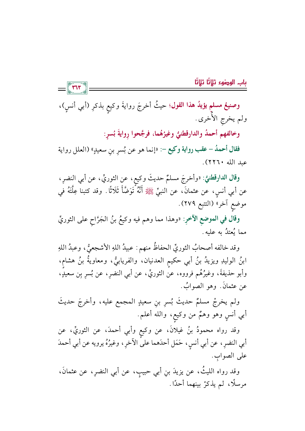 وقال الدارقطنيُّ: "وأخرجَ مسلمٌ حديثَ وكيعٍ، عن الثوريِّ، عن أبي النضرِ، عن أبي أنسٍ، عن عثمانَ، عن النبيِّ صلى الله عليه وسلم أَنَّهُ تَوَضَّأَ ثَلَاثًا. وقد كتبنا عِلَّتَهُ في موضعٍ آخر" (التتبع ٢٧٩).