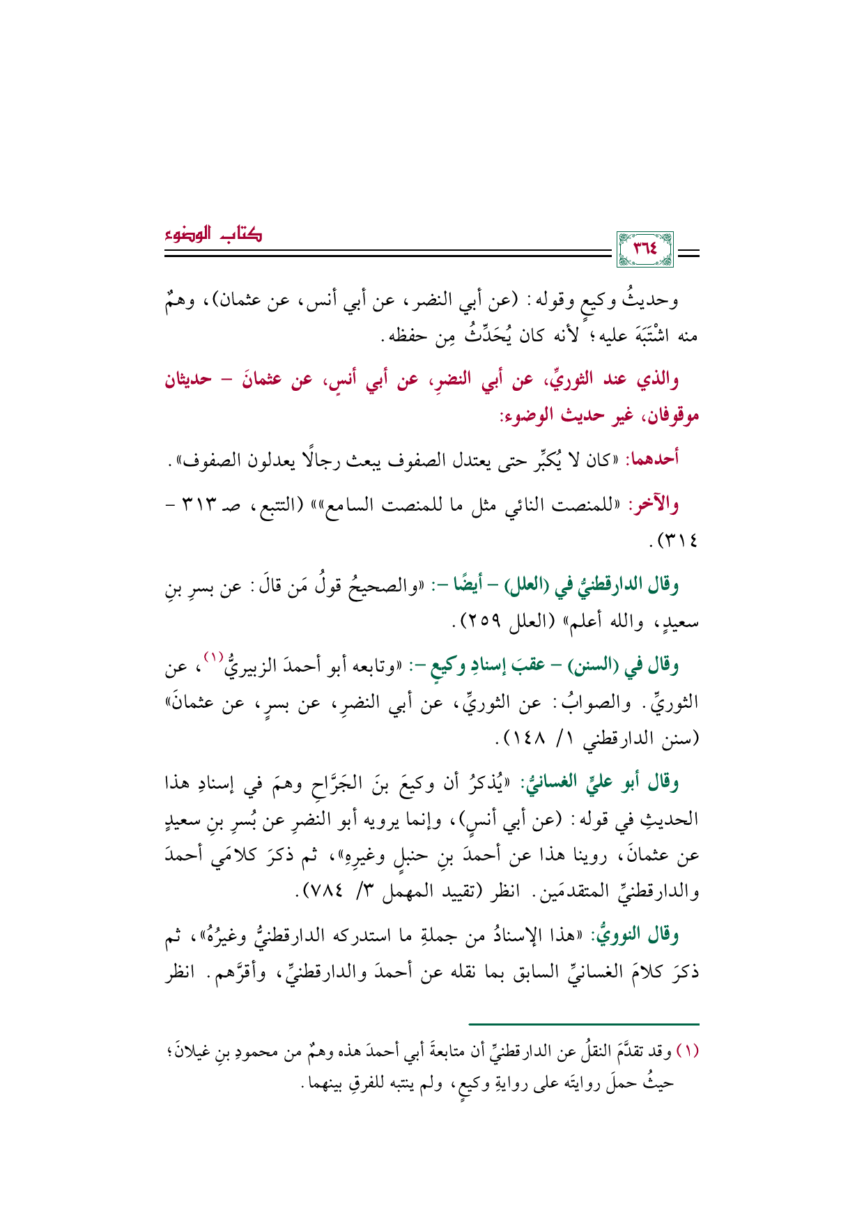 وقال في (السنن) -عقبَ إسنادِ وكيعٍ-: "وتابعه أبو أحمدَ الزبيريُّ (¬١)، عن الثوريِّ. والصوابُ: عن الثوريِّ، عن أبي النضرِ، عن بسرٍ، عن عثمانَ" (سنن الدارقطني ١/ ١٤٨).