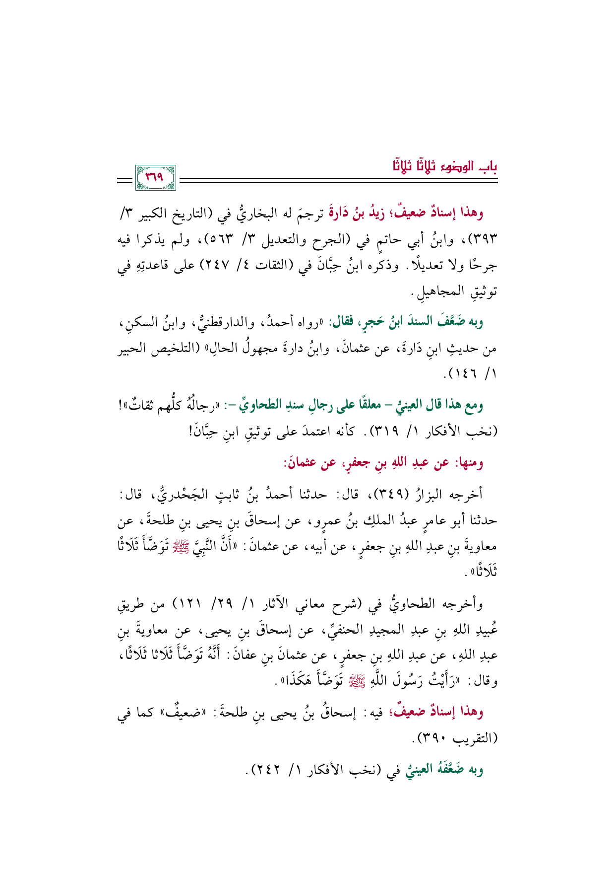 وأخرجه الطحاويُّ في (شرح معاني الآثار ١/ ٢٩/ ١٢١) من طريقِ عُبيدِ اللهِ بنِ عبدِ المجيدِ الحنفيِّ، عن إسحاقَ بنِ يحيى، عن معاويةَ بنِ عبدِ اللهِ، عن عبدِ اللهِ بنِ جعفرٍ، عن عثمانَ بنِ عفانَ: أَنَّهُ تَوَضَّأَ ثَلَاثا ثَلَاثًا، وقال: ((رَأَيْتُ رَسُولَ اللَّهِ صلى الله عليه وسلم تَوَضَّأَ هَكَذَا».