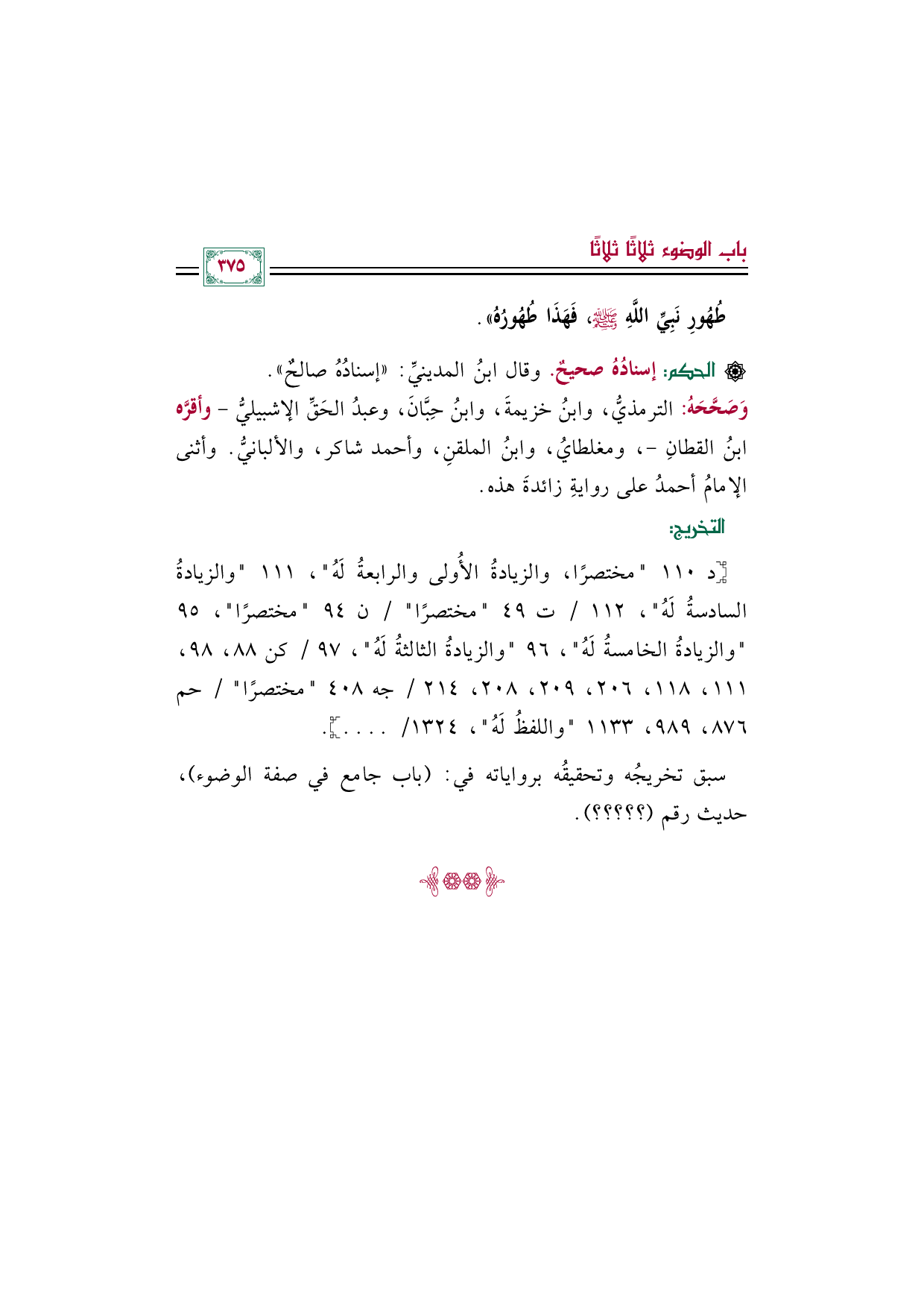 سبق تخريجُه وتحقيقُه برواياته في: (باب جامع في صفة الوضوء)، حديث رقم (؟ ؟ ؟ ؟ ؟ ).