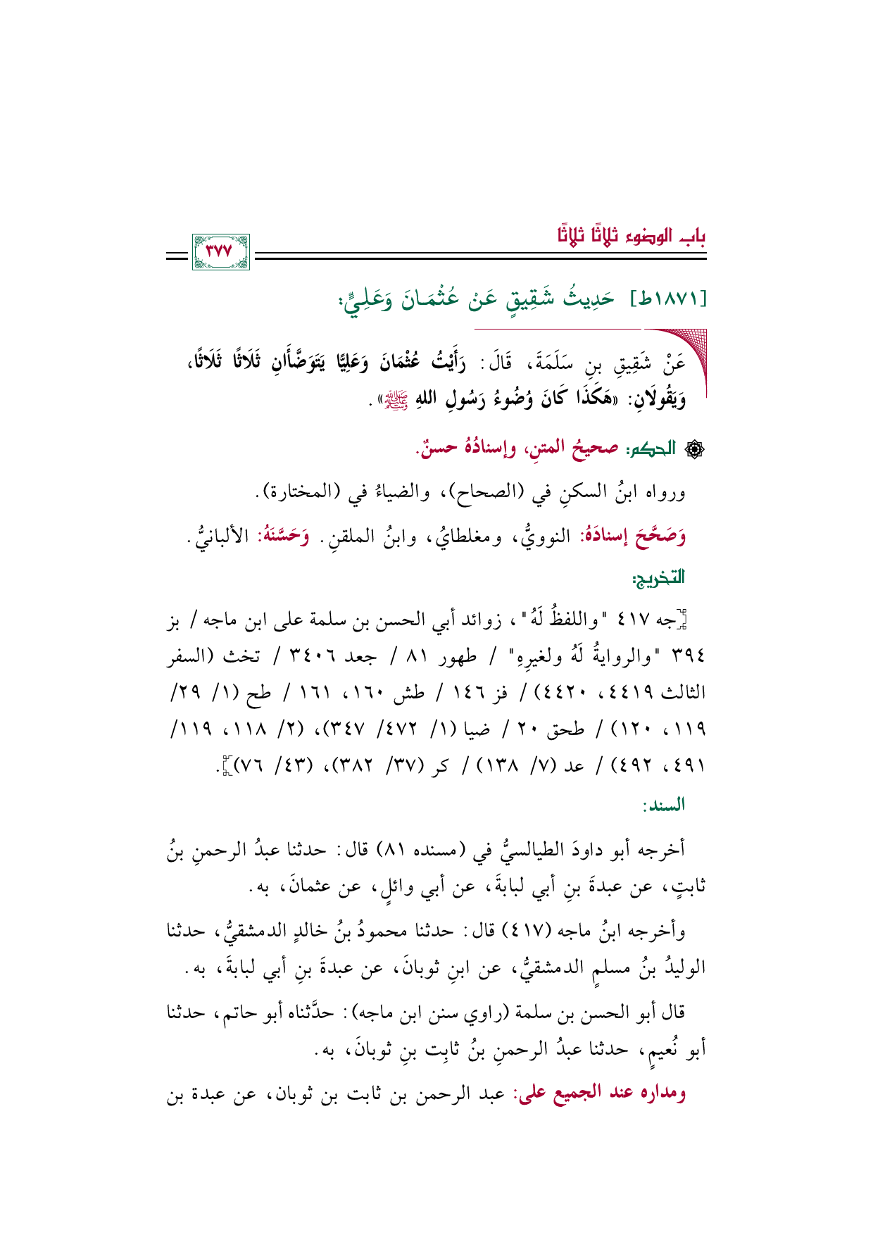 أخرجه أبو داودَ الطيالسيُّ في (مسنده ٨١) قال: حدثنا عبدُ الرحمنِ بنُ ثابتٍ، عن عبدةَ بنِ أبي لبابةَ، عن أبي وائلٍ، عن عثمانَ، به.