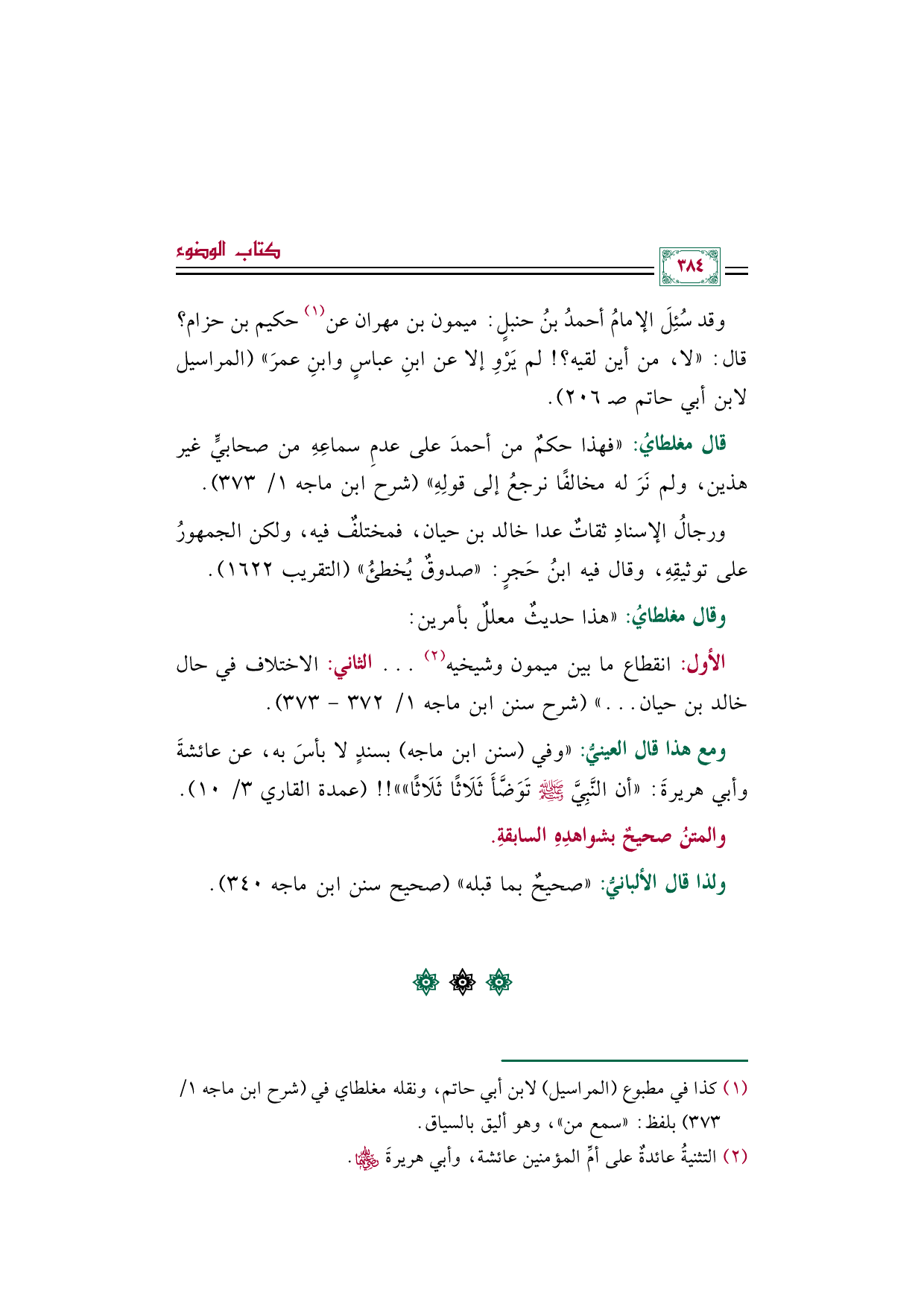 الأول: انقطاع ما بين ميمون وشيخيه (¬٢) ... الثاني: الاختلاف في حال خالد بن حيان ... " (شرح سنن ابن ماجه ١/ ٣٧٢ - ٣٧٣).