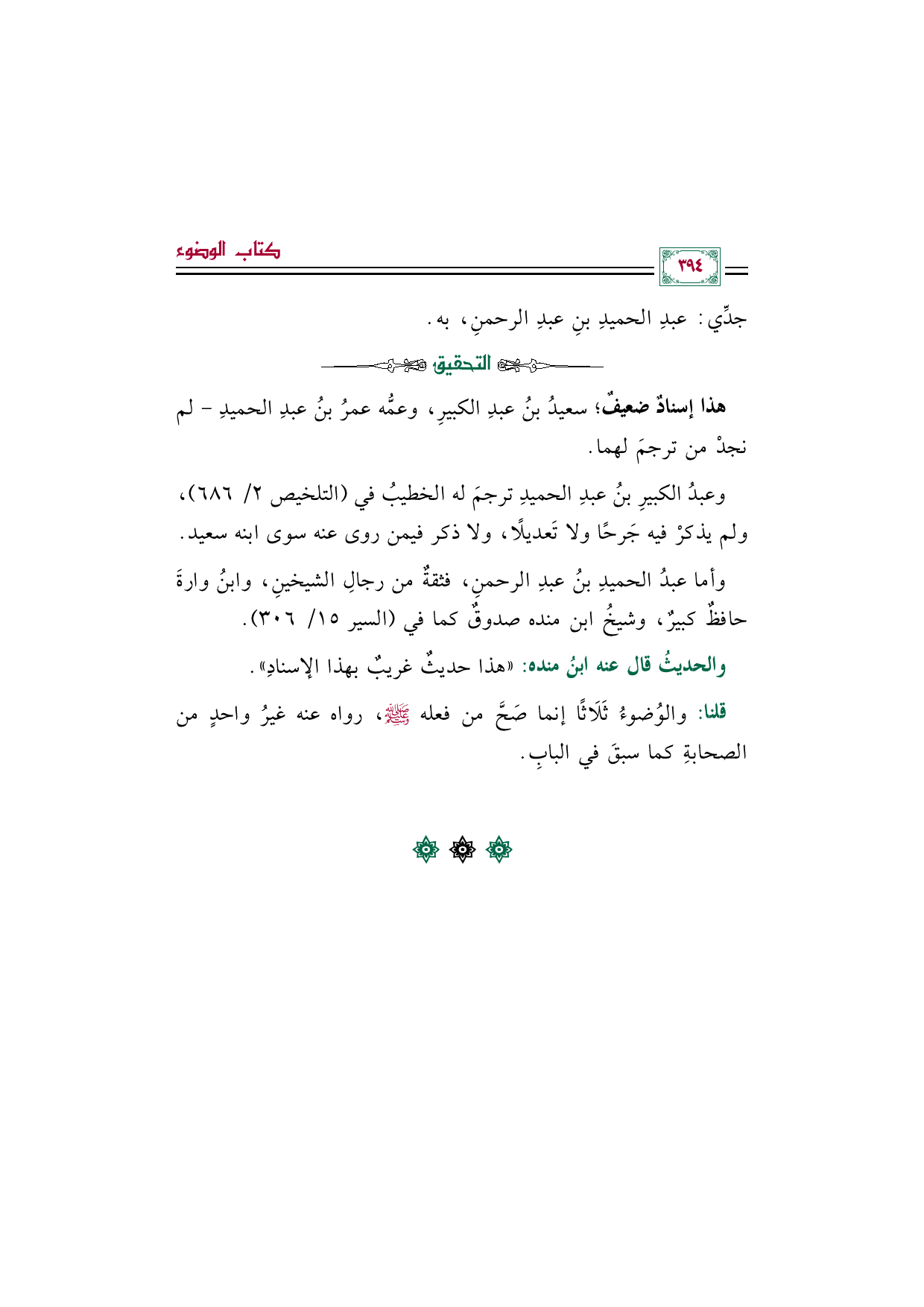 قلنا: والوُضوءُ ثَلَاثًا إنما صَحَّ من فعله صلى الله عليه وسلم، رواه عنه غيرُ واحدٍ من الصحابةِ كما سبقَ في البابِ.