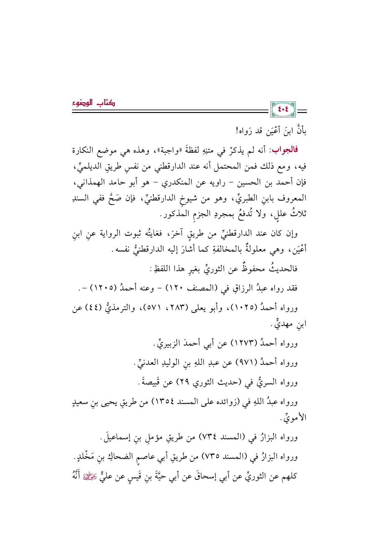وإن كان عند الدارقطنيِّ من طريقٍ آخرَ، فغايتُه ثبوت الرواية عنِ ابنِ أعْيَن، وهي معلولةٌ بالمخالفةِ كما أشارَ إليه الدارقطنيُّ نفسه.