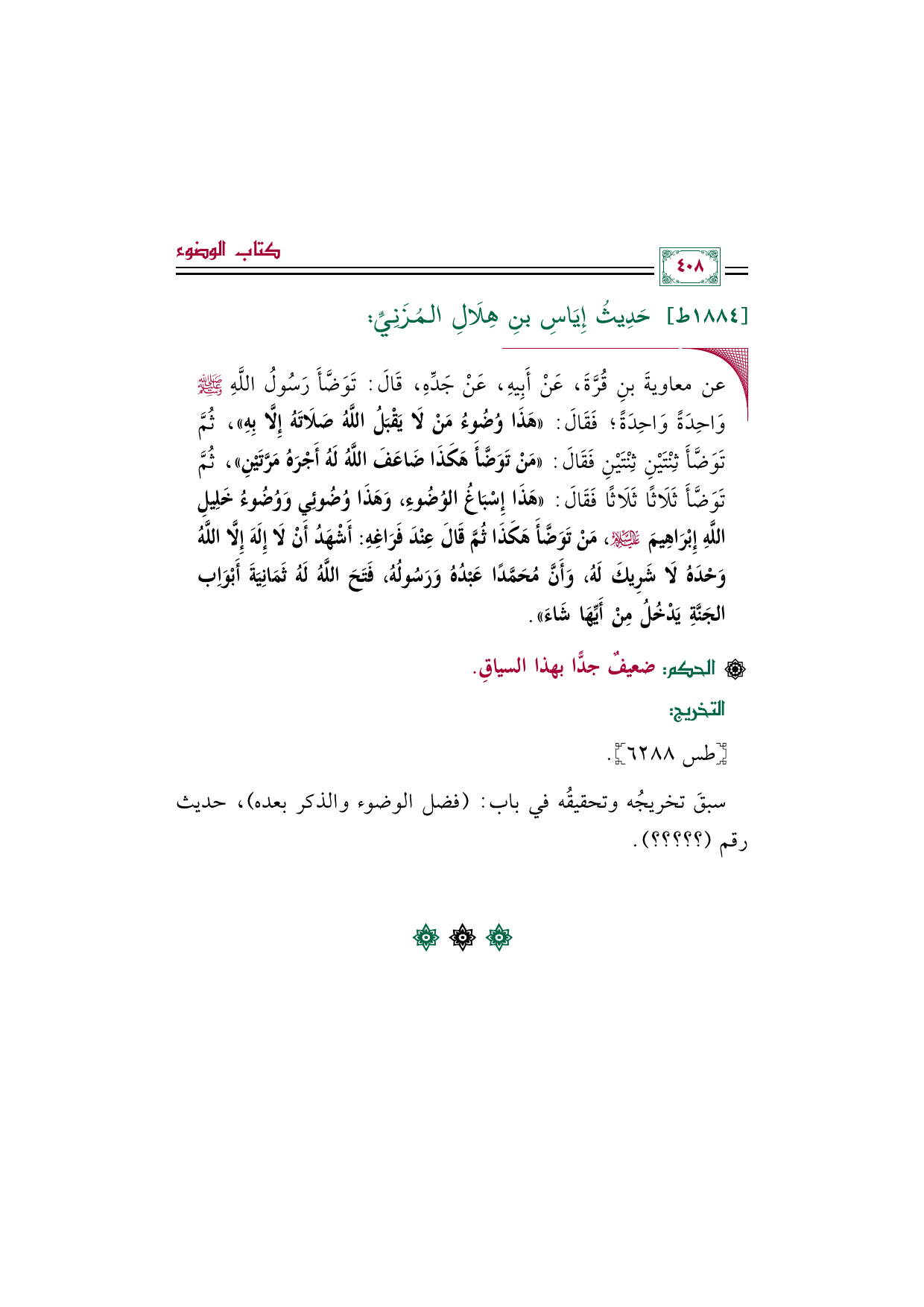 ◼ عن معاويةَ بنِ قُرَّةَ، عَنْ أَبِيهِ، عَنْ جَدِّهِ، قَالَ: تَوَضَّأَ رَسُولُ اللَّهِ صلى الله عليه وسلم وَاحِدَةً وَاحِدَةً؛ فَقَالَ: «هَذَا وُضُوءُ مَنْ لَا يَقْبَلُ اللَّهُ صَلَاتَهُ إِلَّا بِهِ»، ثُمَّ تَوَضَّأَ ثِنْتَيْنِ ثِنْتَيْنِ فَقَالَ: «مَنْ تَوَضَّأَ هَكَذَا ضَاعَفَ اللَّهُ لَهُ أَجْرَهُ مَرَّتَيْنِ»، ثُمَّ تَوَضَّأَ ثَلَاثًا ثَلَاثًا فَقَالَ: «هَذَا إِسْبَاغُ الوُضُوءِ، وَهَذَا وُضُوئِي وَوُضُوءُ خَلِيلِ اللَّهِ إِبْرَاهِيمَ عَلَيْهِ السَّلَامُ، مَنْ تَوَضَّأَ هَكَذَا ثُمَّ قَالَ عِنْدَ فَرَاغِهِ: أَشْهَدُ أَنْ لَا إِلَهَ إِلَّا اللَّهُ وَحْدَهُ لَا شَرِيكَ لَهُ، وَأَنَّ مُحَمَّدًا عَبْدُهُ وَرَسُولُهُ، فَتَحَ اللَّهُ لَهُ ثَمَانِيَةَ أَبْوَاِب الجَنَّةِ يَدْخُلُ مِنْ أَيِّهَا شَاءَ».