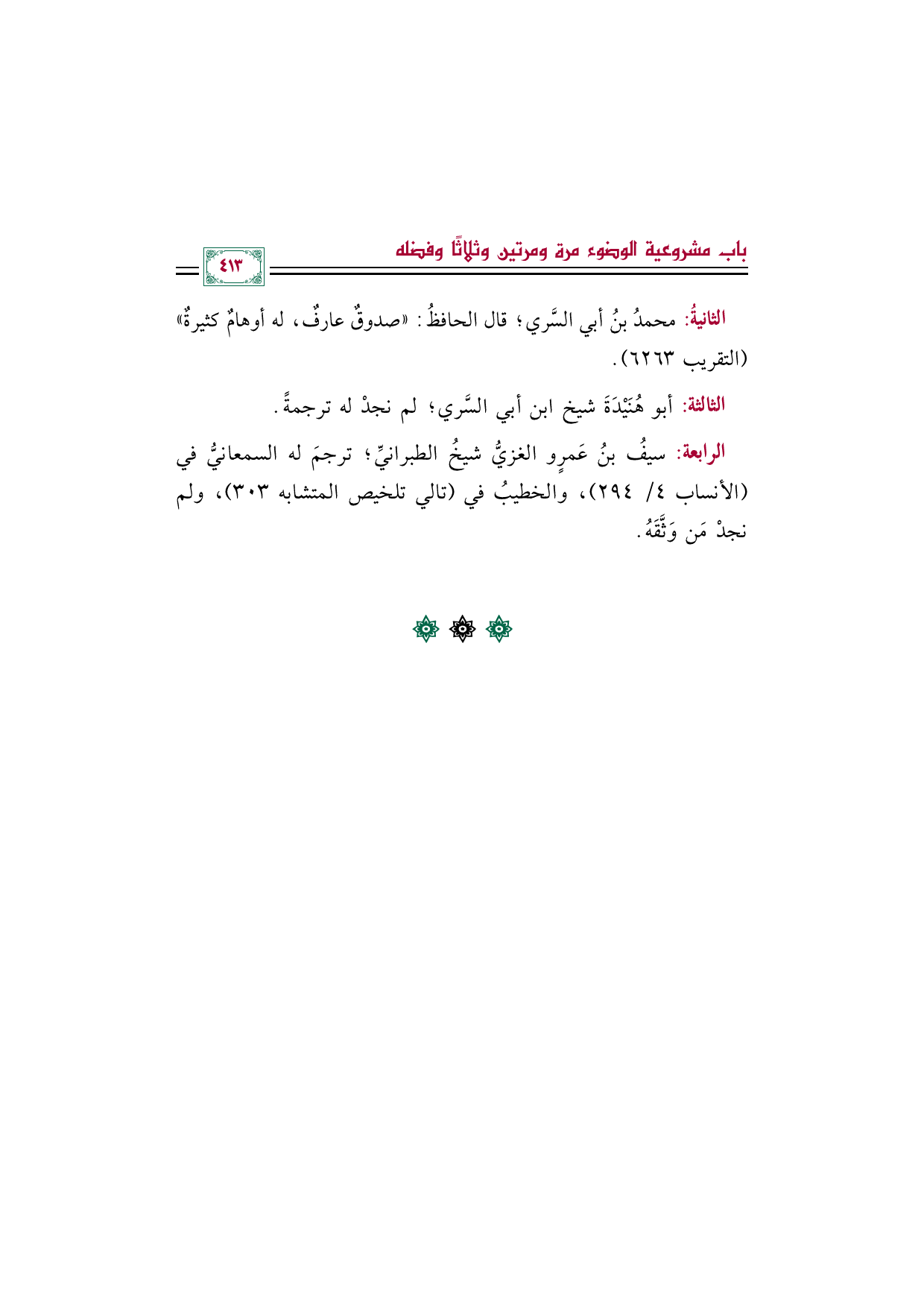 الرابعة: سيفُ بنُ عَمرٍو الغزيُّ شيخُ الطبرانيِّ؛ ترجمَ له السمعانيُّ في (الأنساب ٤/ ٢٩٤)، والخطيبُ في (تالي تلخيص المتشابه ٣٠٣)، ولم نجدْ مَن وَثَّقَهُ.