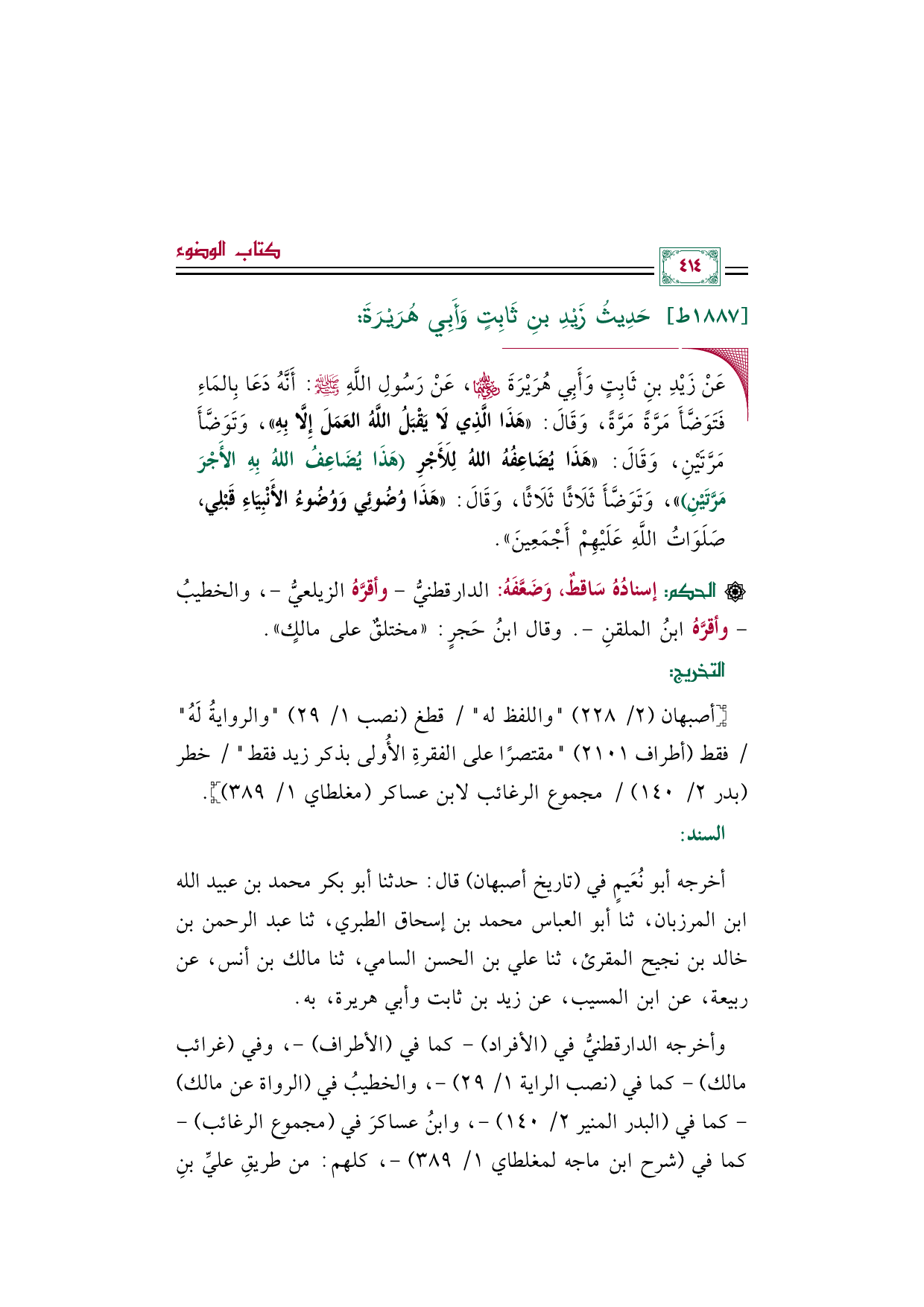 أخرجه أبو نُعَيمٍ في (تاريخ أصبهان) قال: حدثنا أبو بكر محمد بن عبيد الله بن المرزبان، ثنا أبو العباس محمد بن إسحاق الطبري، ثنا عبد الرحمن بن خالد بن نجيح المقرئ، ثنا علي بن الحسن السامي، ثنا مالك بن أنس، عن ربيعة، عن ابن المسيب، عن زيد بن ثابت وأبي هريرة، به.