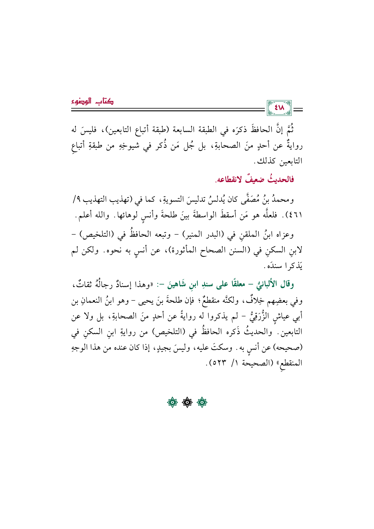 وقال الألبانيُّ -معلقًا على سندِ ابنِ شَاهينَ-: "وهذا إسنادٌ رجالُهُ ثقاتٌ، وفي بعضِهم خِلافٌ، ولكنَّه منقطعٌ؛ فإن طلحةَ بنَ يحيى -وهو ابنُ النعمانِ بن أبي عياشٍ الزُّرَقِيُّ -لم يذكروا له روايةً عن أحدٍ منَ الصحابةِ، بل ولا عن التابعين. والحديثُ ذَكره الحافظُ في (التلخيص) من روايةِ ابنِ السكنِ في (صحيحه) عن أنسٍ به. وسكتَ عليه، وليسَ بجيدٍ، إذا كان عنده من هذا الوجهِ المنقطعِ" (الصحيحة ١/ ٥٢٣).