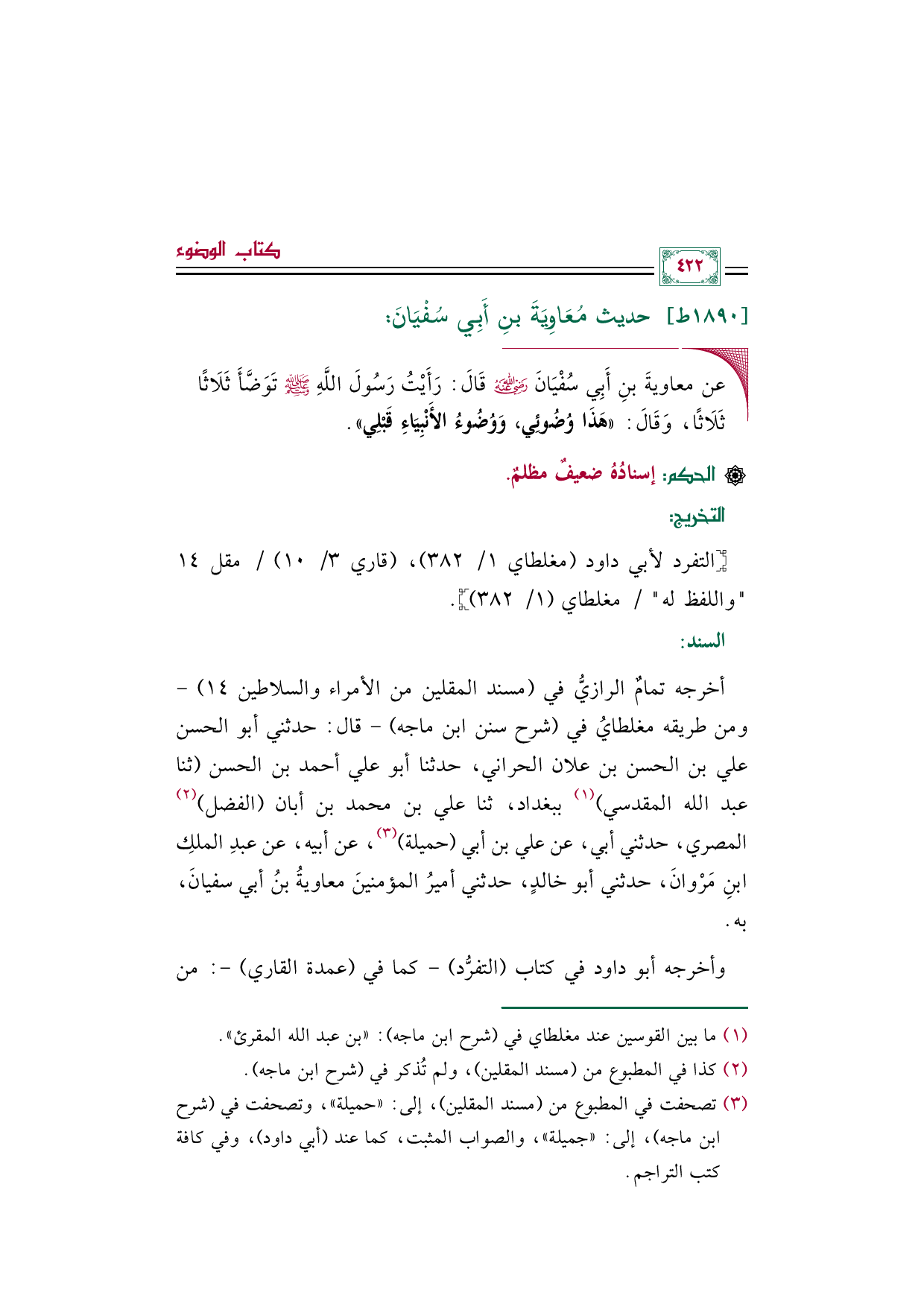 أخرجه تمامٌ الرازيُّ في (مسند المقلين من الأمراء والسلاطين ١٤) -ومن طريقه مغلطايُ في (شرح سنن ابن ماجه) - قال: حدثني أبو الحسن علي بن الحسن بن علان الحراني، حدثنا أبو علي أحمد بن الحسن (ثنا عبد الله المقدسي) (¬١) ببغداد، ثنا علي بن محمد بن أبان (الفضل) (¬٢) المصري، حدثني أبي، عن علي بن أبي (حميلة) (¬٣)، عن أبيه، عن عبدِ الملكِ بنِ مَرْوانَ، حدثني أبو خالدٍ، حدثني أميرُ المؤمنينَ معاويةُ بنُ أبي سفيانَ، به.