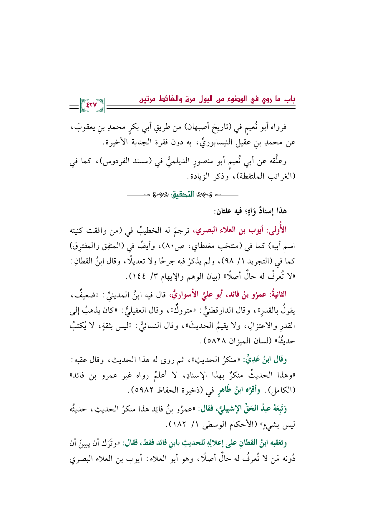 وتعَقبه ابنُ القطانِ على إعلالِهِ للحديثِ بابنِ فائد فقط، فقال: "وتَرَك أن يبينَ أن دُونه مَن لا تُعرفُ له حالٌ أصلًا، وهو أبو العلاء: أيوب بن العلاء البصري