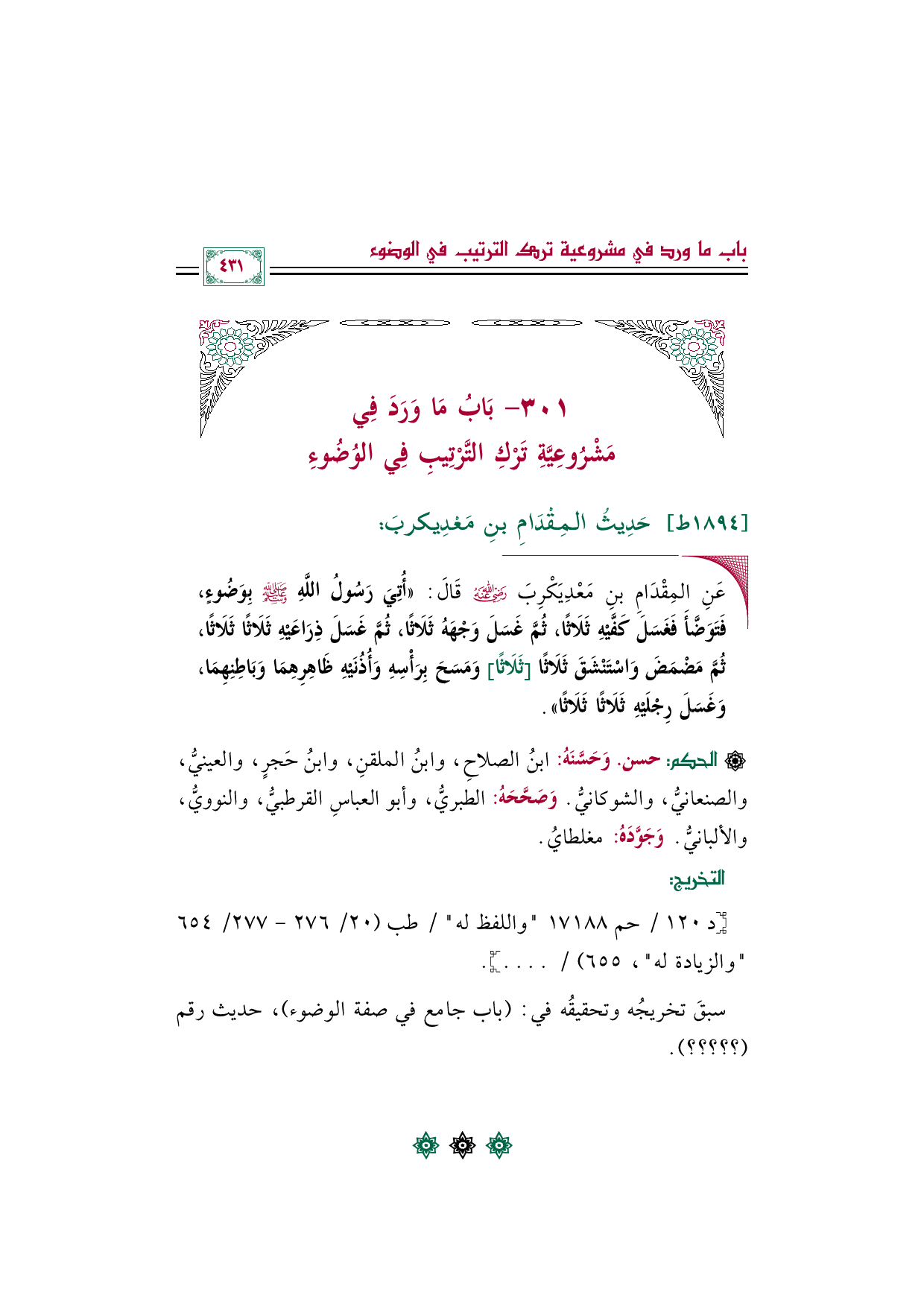 ٣٠١ - بَابُ مَا وَرَدَ فِي مَشْرُوعِيَّةِ تَرْكِ التَّرْتِيبِ فِي الوُضُوءِ