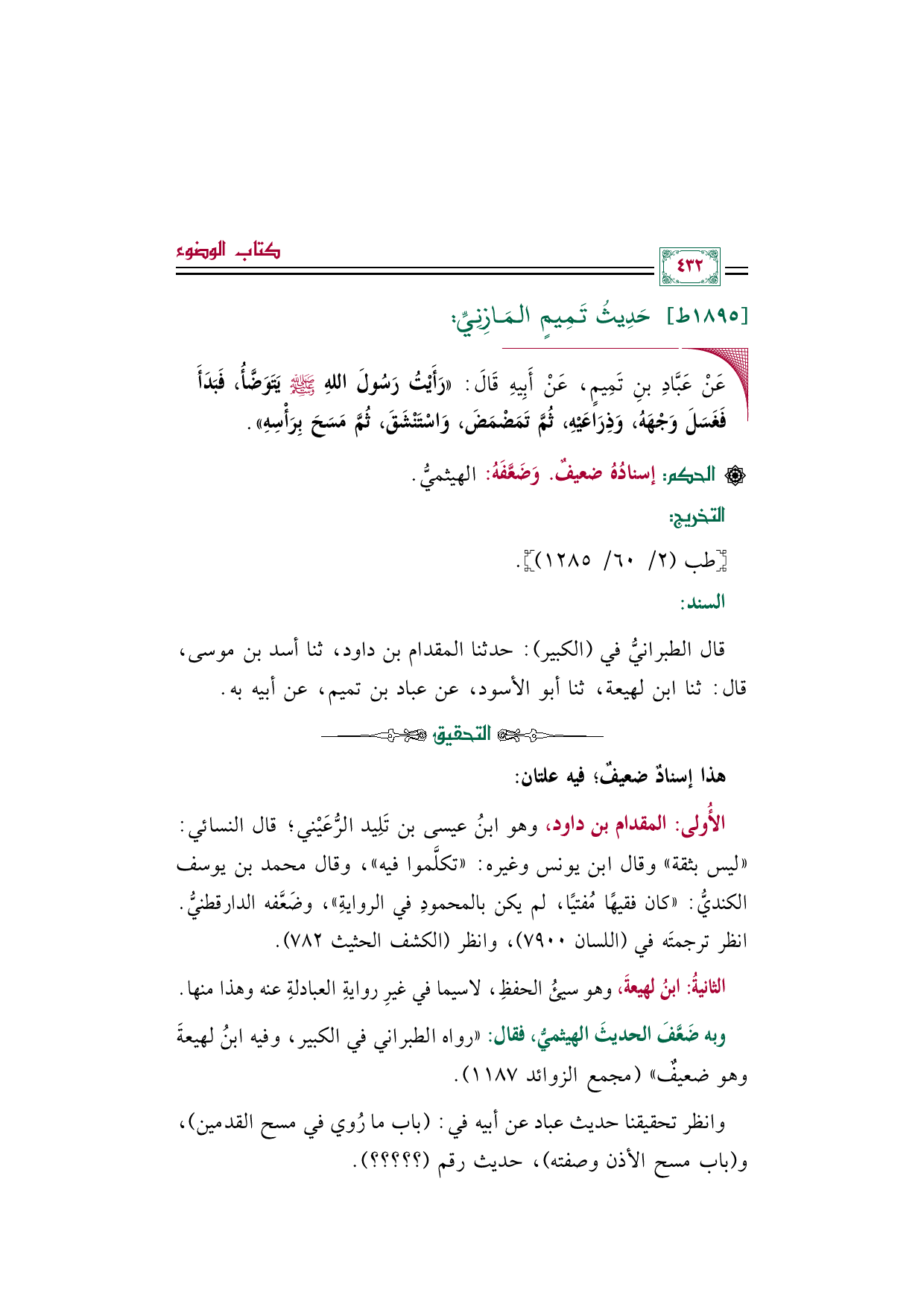 وانظر تحقيقنا حديث عباد عن أبيه في: (باب ما رُوي في مسح القدمين)، و (باب مسح الأذن وصفته)، حديث رقم ( ... ).