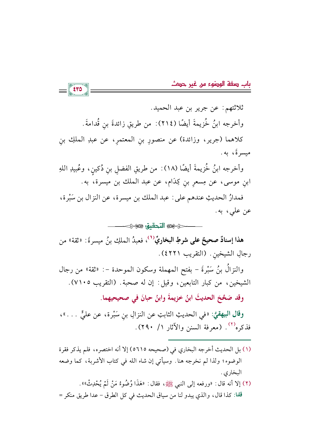 وقد سبقَ البيهقيَّ لمثل هذا أبو زرعة الرازيُّ، كما سيأتي عند الكلام على الرواية المنكرة المشارة إليها. والصواب ما ذكرنا، وقد جاء منصوصًا عليه صراحة في (شعب الإيمان ٥٥٨٠) من طريق الطيالسي عن شعبة، به. حيث قال في آخره: "قال علي رضي الله عنه: هَذَا وُضُوءُ مَنْ لَمْ يُحْدِثْ". وقد وقع هذا القول في طريق مسعر وغيره عقب قوله: "فتمسح به"، مما يدل دلالة جازمة على أن القائل هو علي رضي الله عنه. وقد نصَّ على وقفه المزيُّ في (تهذيب الكمال ٢٩/ ٣٣٦)، والله أعلم.