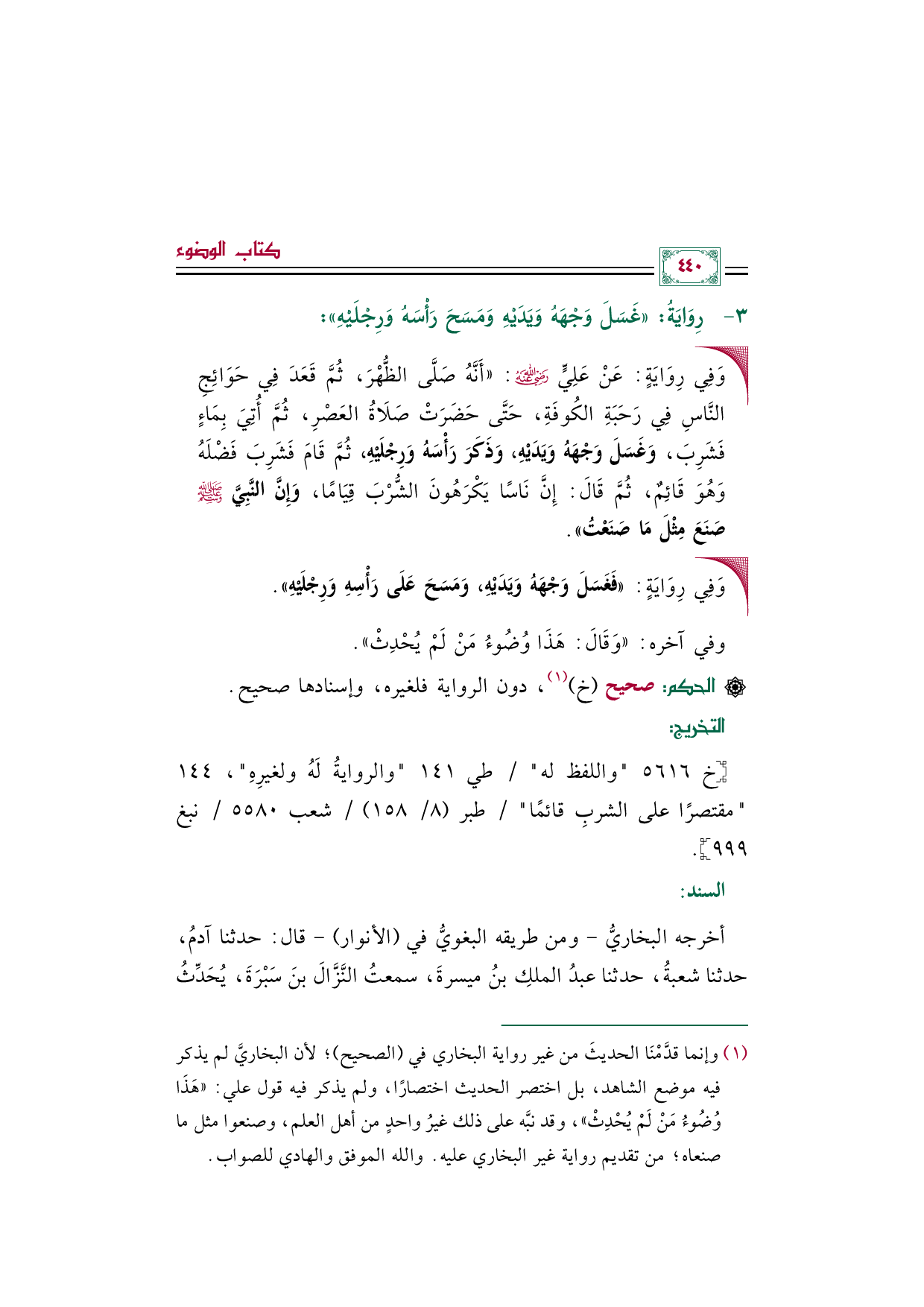 (¬١) وإنما قدَّمْنَا الحديثَ من غير رواية البخاري في (الصحيح)؛ لأن البخاريَّ لم يذكر فيه موضع الشاهد، بل اختصر الحديث اختصارًا، ولم يذكر فيه قول علي: ((هَذَا وُضُوءُ مَنْ لَمْ يُحْدِثْ))، وقد نبَّه على ذلك غيرُ واحدٍ من أهل العلم، وصنعوا مثل ما صنعاه؛ من تقديم رواية غير البخاري عليه. والله الموفق والهادي للصواب.