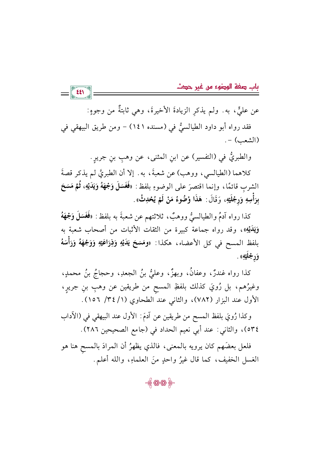 كلاهما (الطيالسي، ووهب) عن شعبةَ، به. إلا أن الطبريَّ لم يذكر قصةَ الشربِ قائمًا، وإنما اقتصرَ على الوضوءِ بلفظ: ((فَغَسَلَ وَجْهَهُ وَيَدَيْهِ، ثُمَّ مَسَحَ بِرَأْسِهِ وَرِجْلَيْهِ، وَقَالَ: هَذَا وُضُوءُ مَنْ لَمْ يُحْدِثْ)).