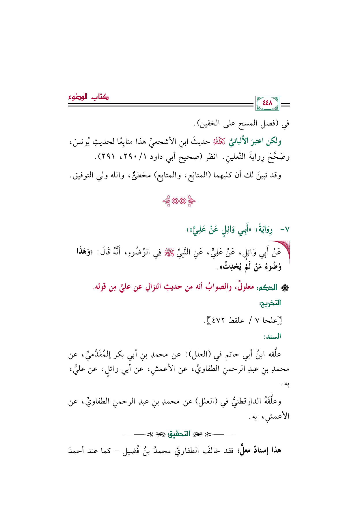 • عَنْ أَبِي وَائِلٍ، عَنْ عَلِيٍّ، عَنِ النَّبِيِّ صلى الله عليه وسلم فِي الوُضُوءِ، أَنَّهُ قَالَ: ((وَهَذَا وُضُوءُ مَنْ لَمْ يُحْدِثْ)).