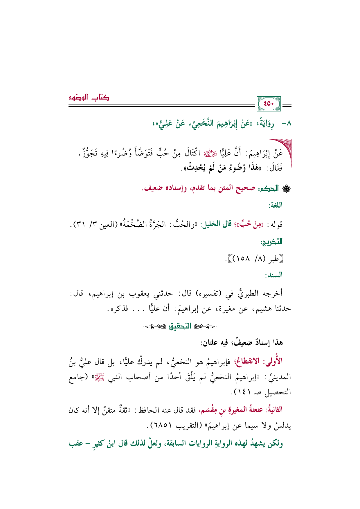 الأُولى: الانقطاعُ؛ فإبراهيمُ هو النخعيُّ، لم يدركْ عليًّا، بل قال عليُّ بنُ المدينيِّ: "إبراهيمُ النخعيُّ لم يَلْقَ أحدًا من أصحاب النبي صلى الله عليه وسلم" (جامع التحصيل صـ ١٤١).