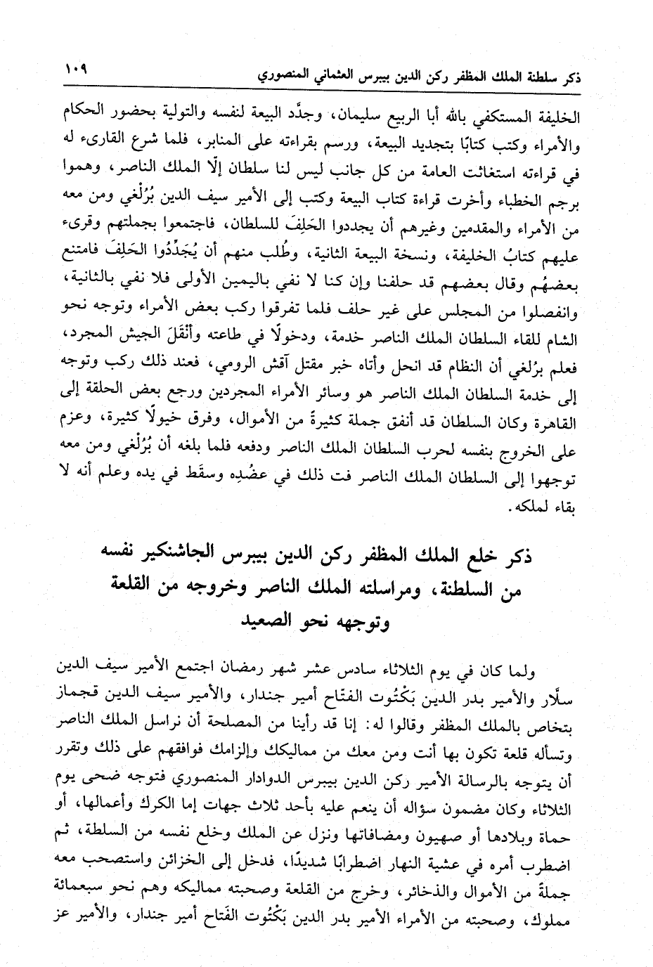 في قراءته استغاثت العامة من كل جانب ليس لنا سلطان إلا الملك الناصر ، وهموا